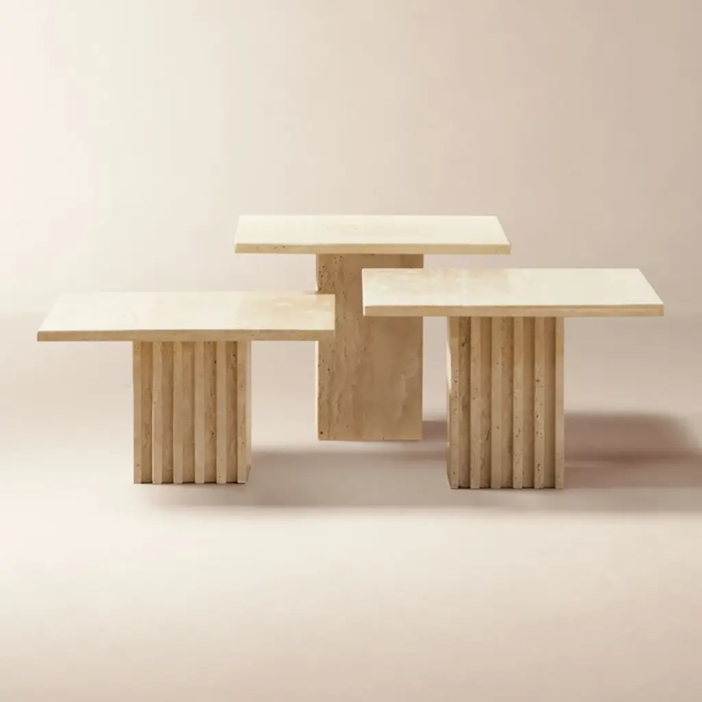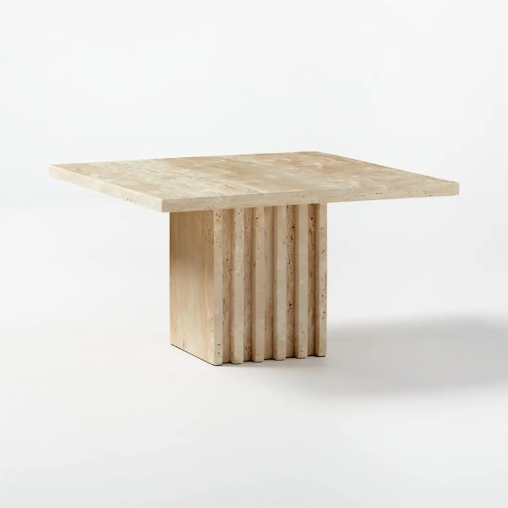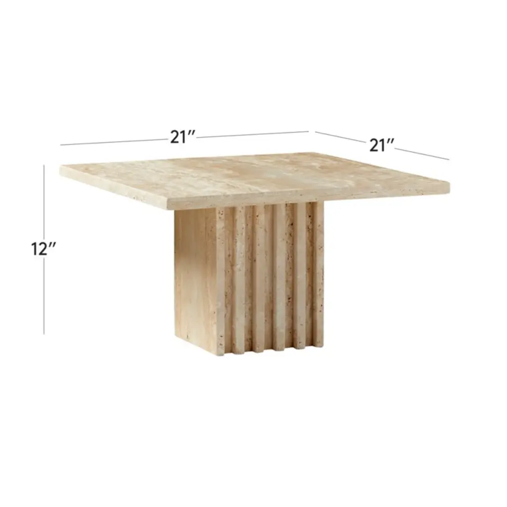 Designed by Studio ANANSI, square side table is made of pure, unpolished travertine inspired by 1970s Italian modern designs. Featuring an architectural silhouette in a style we're calling "soft brutalism." Fluted details on the base and variation in the natural travertine add to the coveted vintage feel. CB2 exclusive.