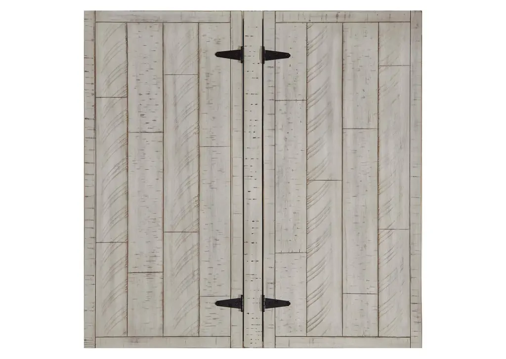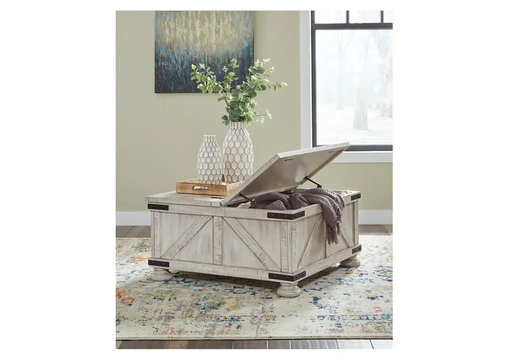 Double up on form and function with the Carynhurst square coffee table with storage. Its dual-lid tabletop provides easy access to the roomy storage space. Crafted with a distressed whitewash finish, crossbuck detailing and metal bracket appliques, this generously scaled coffee table is rustic farmhouse living at its best. Weight 81.000 lbs. (36.45kgs.)