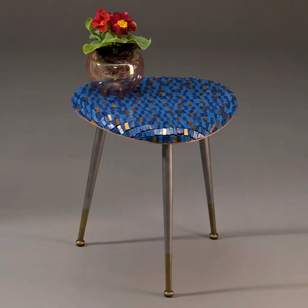 Stunning in its simplicity, this coffee table belongs to a series characterized by a triangular top covered with glass mosaic tiles handcrafted by Orsoni and assembled by hand by Michela Nardin. A design of timeless elegance that reflects the unparalleled mastery of Italian artisans, the Acqua is composed of 2100 tiles in two gradients of blue and some enriched with 24k gold foil, creating a mesmerizing interplay of textures and reflections. The Tuscan-made legs are finished in antiqued brass.