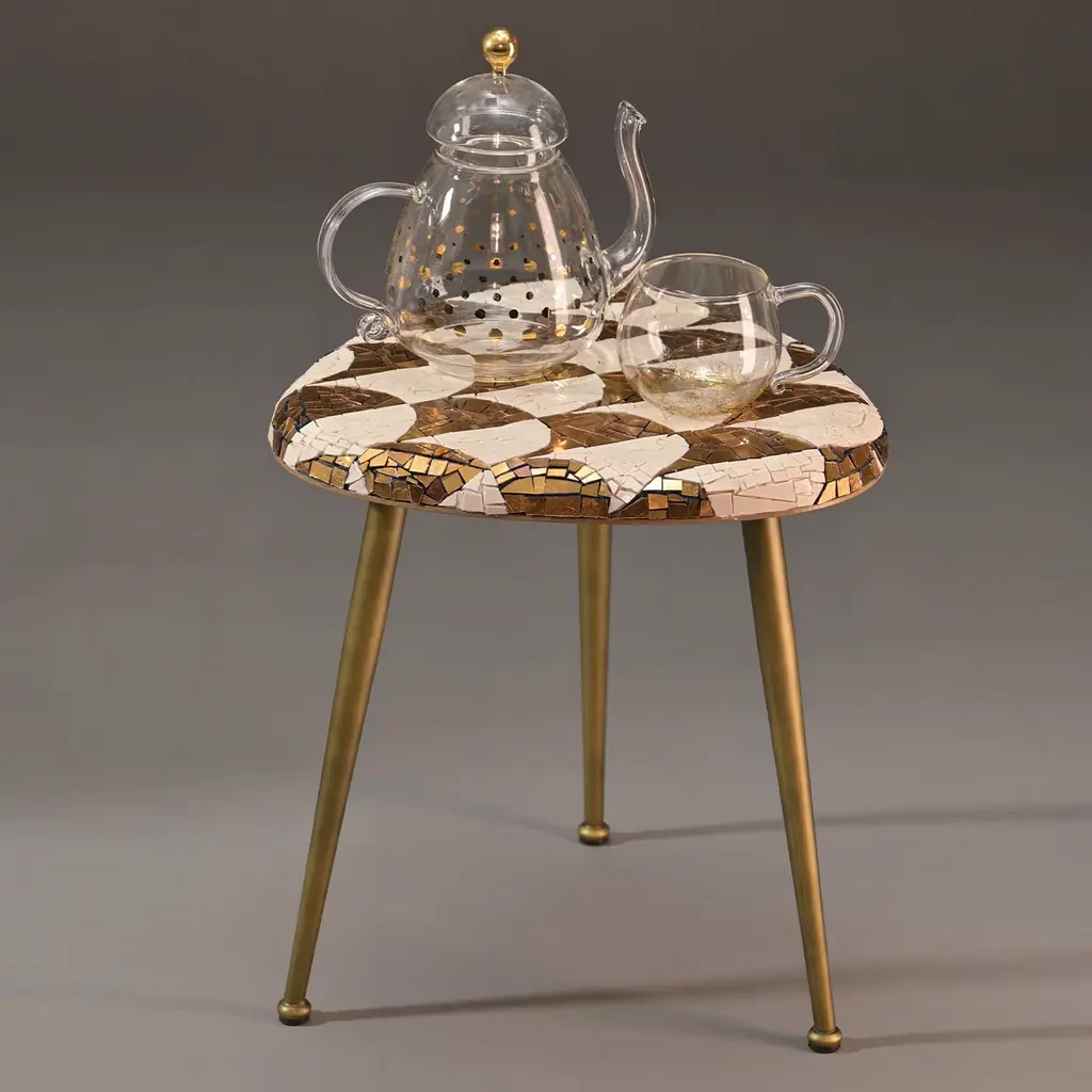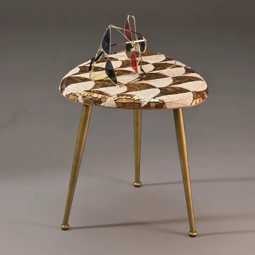 Part of a series by renowned designer Michela Nardin, the Palmira is a unique coffee table that combines elements created by Italian artisan excellence. Raised on tripod bronzed metal legs are handcrafted in Tuscan, the triangular wooden top crafted by artisans from Vicenza is entirely covered with a superb mosaic composed of 1100 “spizzi” (hand-cut irregularly shaped glass tiles) made in Venice by Orsoni, some white and some enriched with 24K gold leaf.