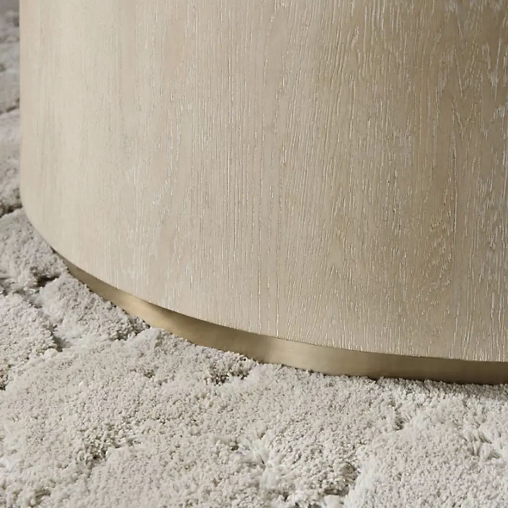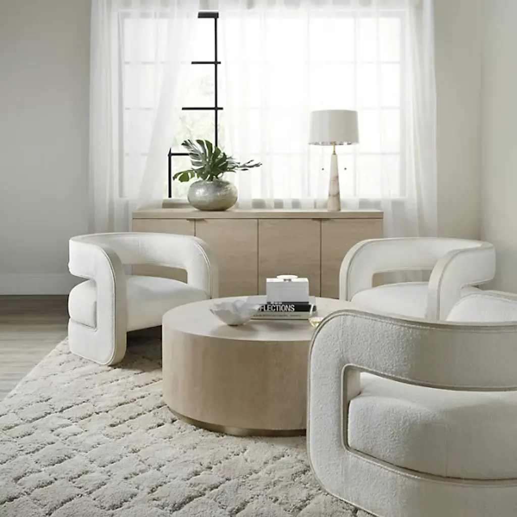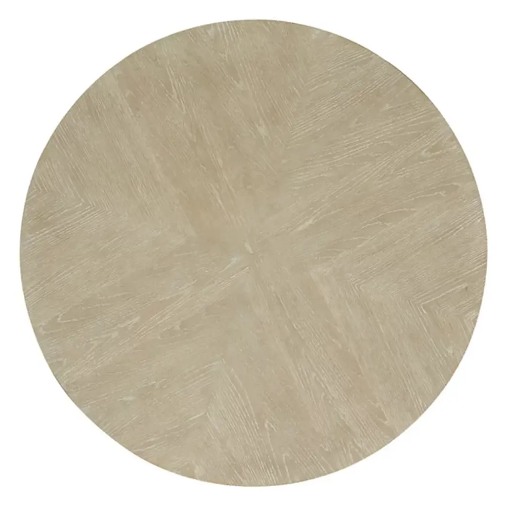 The Cascade Cocktail Table from Hooker Furniture combines a soft taupe oak veneer top with a champagne-colored metal base that adds metallic sparkle. The round shape creates gentle curves while the dry brushing technique enhances the wood's natural texture and grain variations, and the matched veneer top ensures consistent wood grain patterns across the surface. This piece demonstrates how neutral tones and mixed materials can create calming, sophisticated furniture with contemporary functionality.