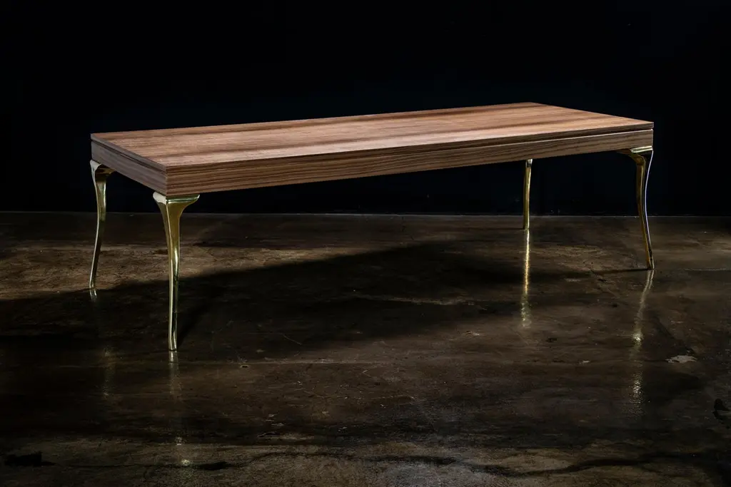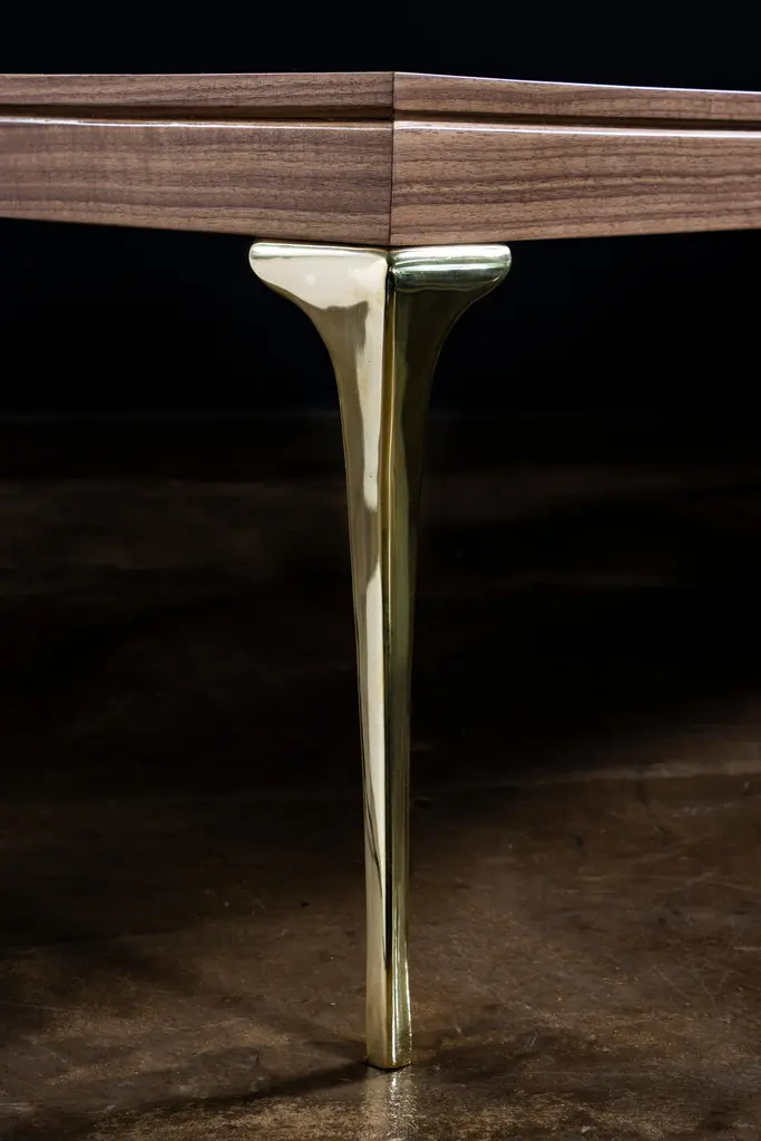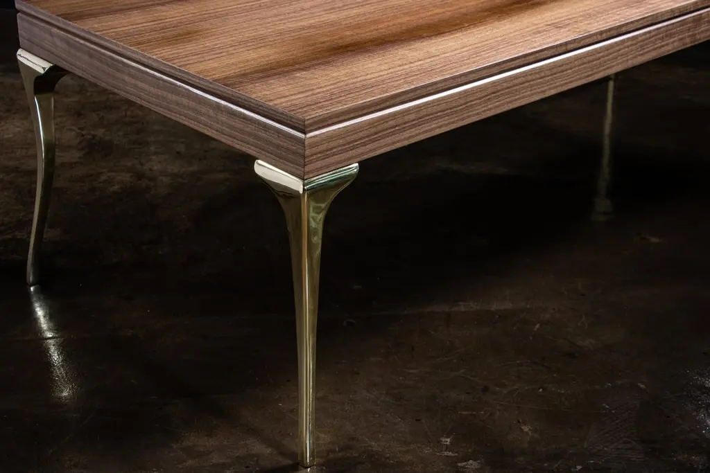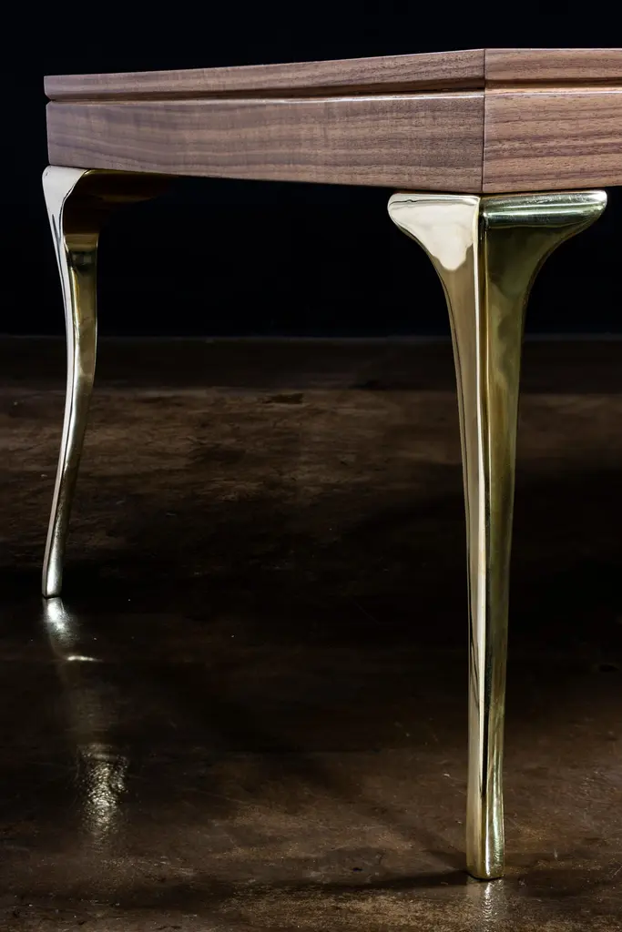 The Enzio Coffee Table features a modern take on a classic Queen Anne form in its cast bronze legs. Available as shown with a walnut top, or in any size, shape or material including stone, metal, or other wood species and finishes.