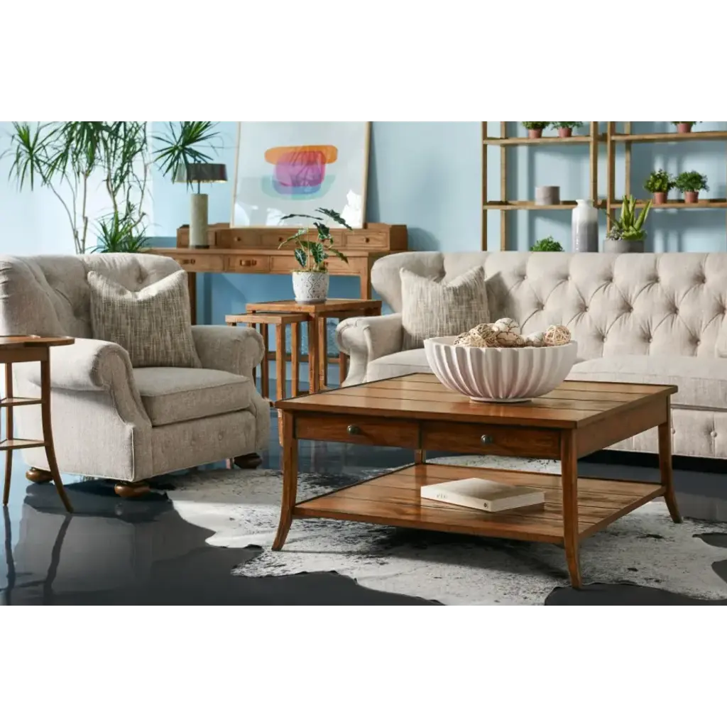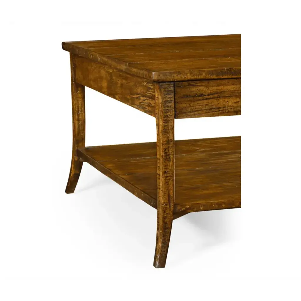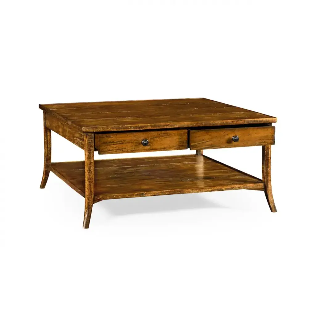 491041-CFW Square country walnut coffee table with two drawers and brass handles.