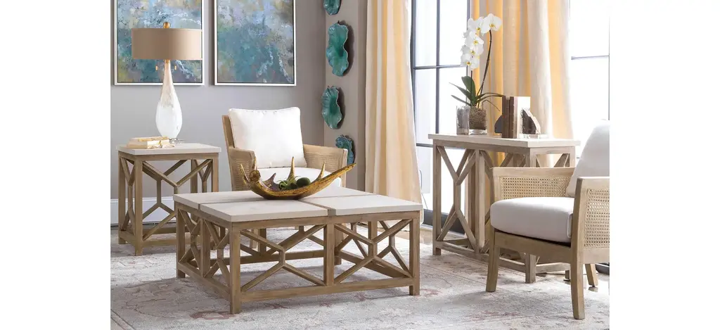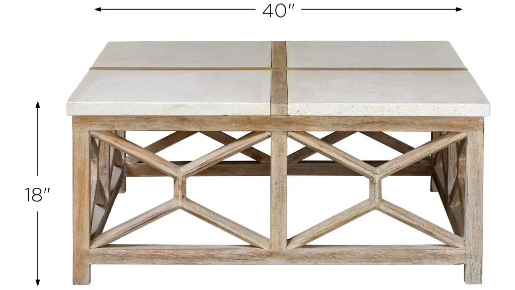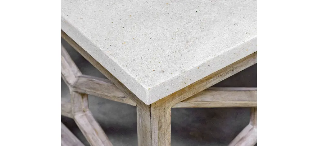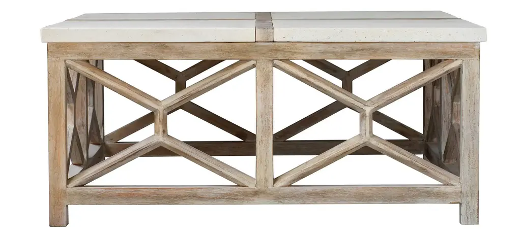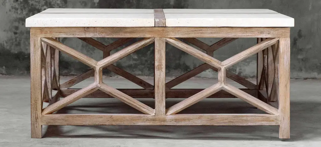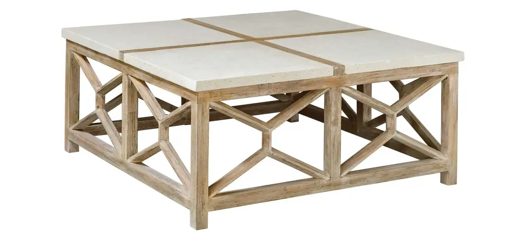 The Catali Stone Coffee Table, handcrafted from solid mixed woods with a natural ivory limestone top, on a geometric base finished in a warm oatmeal wash. true to the characteristics of natural stone, each piece will have unique coloration and veining. solid wood will continue to move with temperature and humidity changes, which can result in cracks and uneven surfaces, adding to its authenticity and character.