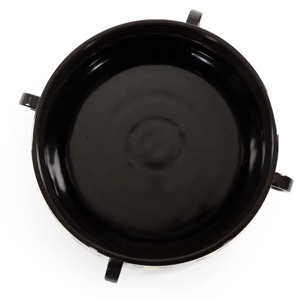 This striking centerpiece exudes playful elegance. It was designed in 1985 by the pattern designer of the Memphis group, Nathalie Du Pasquier, and crafted of ceramic. The internal surface of the bowl and the four small handles are painted black, while the white exterior is adorned with a colorful band with asymmetrical patterns in yellow and pink with black details. This piece will make a superb centerpiece on a modern dining table or an eye-catching display container for collectibles on a contemporary coffee table.