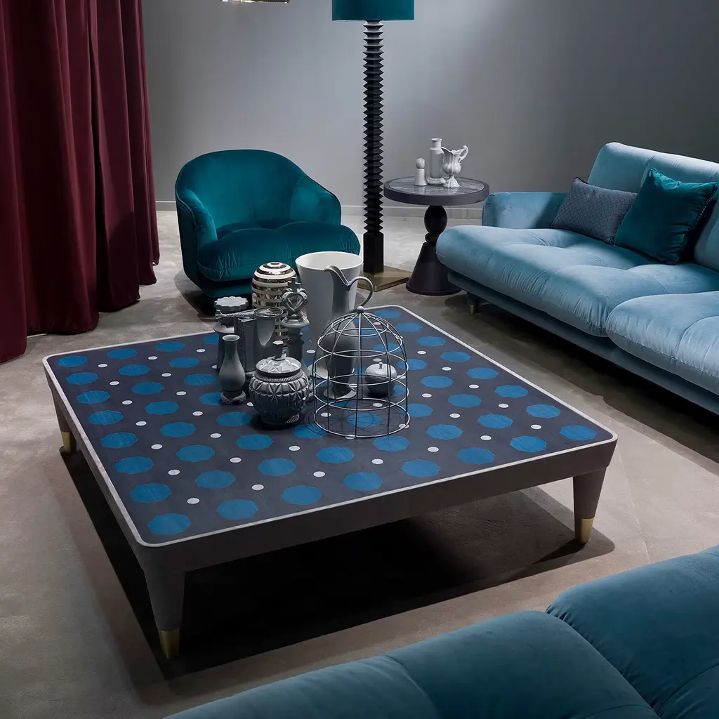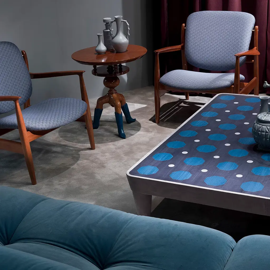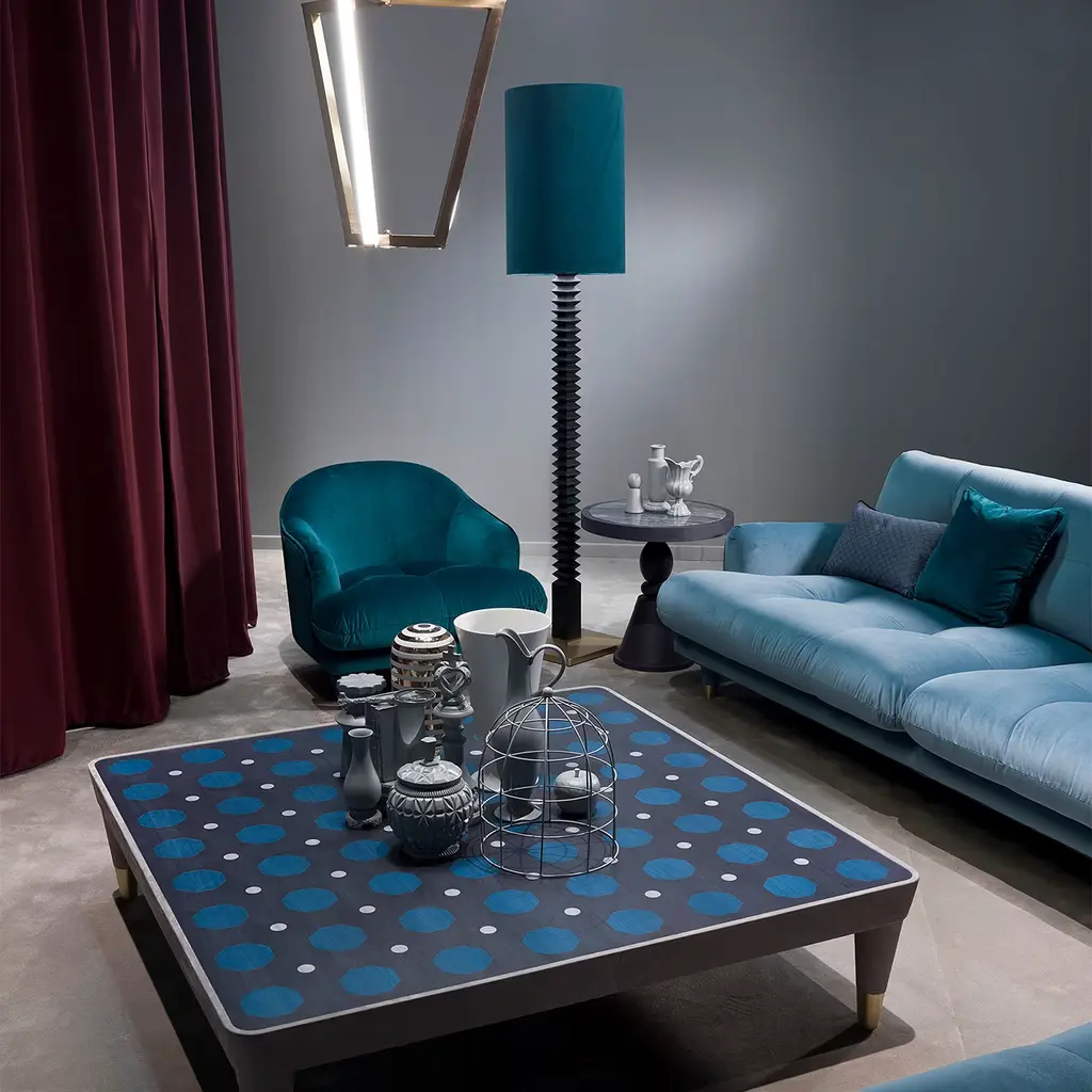 The coffee table uses satin-finished brass tips as a starting point, the fil rouge that stylistically links the Century family. The structure and the feet, covered in precious nubuck, support the spectacular inlaid top. In fact, in the background of dark gray stained veneer wood, the designers have actually added a geometric pattern composed of pear wood inlay, in the white and blue colors of Prussia. The chromatic combinations and the impressive dimensions of this object make it perfect for the most charismatic and sumptuous environments.