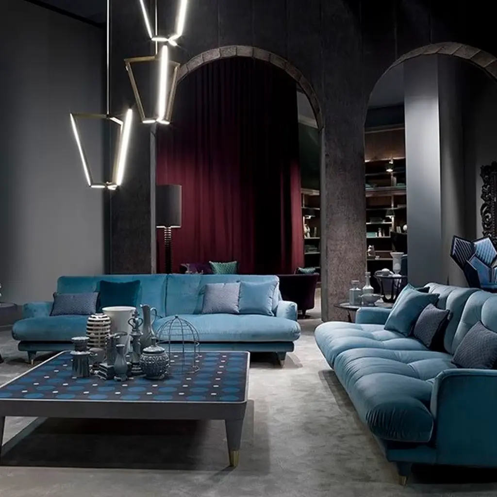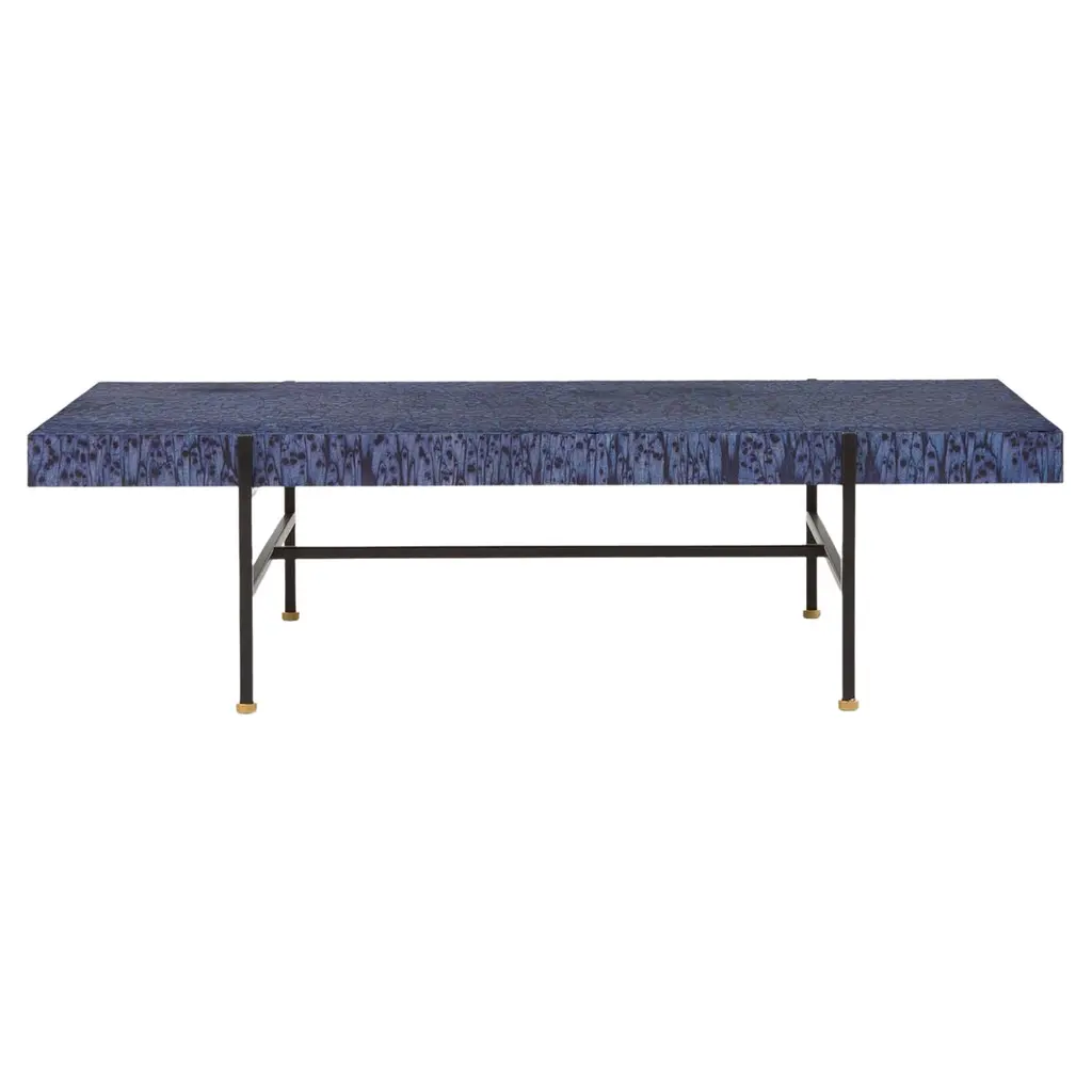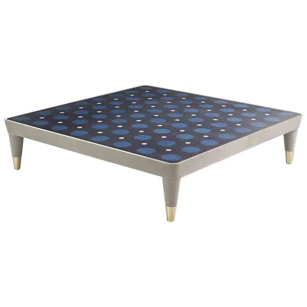 The coffee table uses satin-finished brass tips as a starting point, the fil rouge that stylistically links the Century family. The structure and the feet, covered in precious nubuck, support the spectacular inlaid top. In fact, in the background of dark gray stained veneer wood, the designers have actually added a geometric pattern composed of pear wood inlay, in the white and blue colors of Prussia. The chromatic combinations and the impressive dimensions of this object make it perfect for the most charismatic and sumptuous environments.