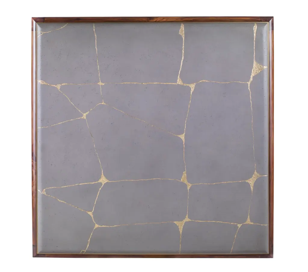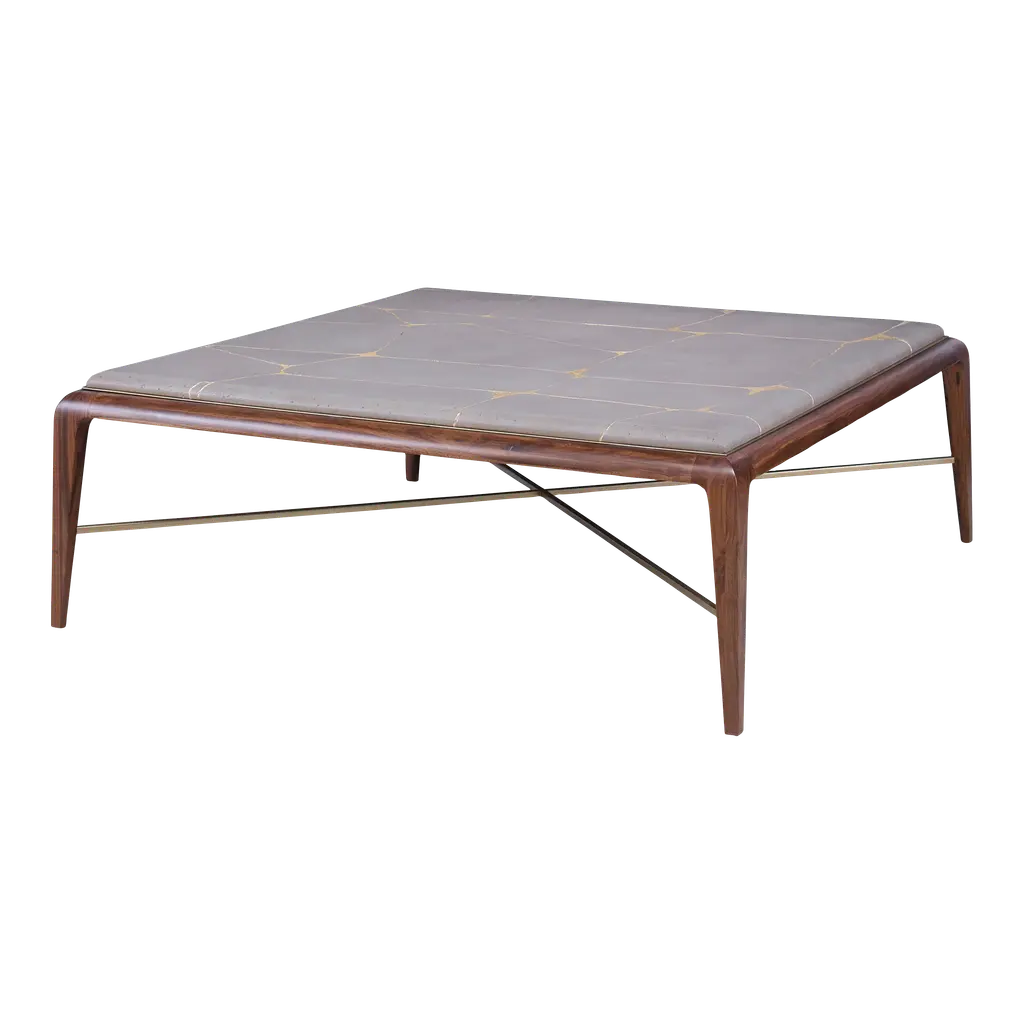Named after the Japanese Art of repairing broken pottery by mending the areas of breakage with lacquer dusted or mixed with powdered gold and silver this cocktail table features a solid walnut base with a brass "X" stretcher. The cast concrete top mimics the Kintsugi technique creating a stunning and unique surface. Also available as a side table. Dust with a soft, clean cloth slightly moistened with water, and dry completely with another clean cloth, always rubbing with the grain.