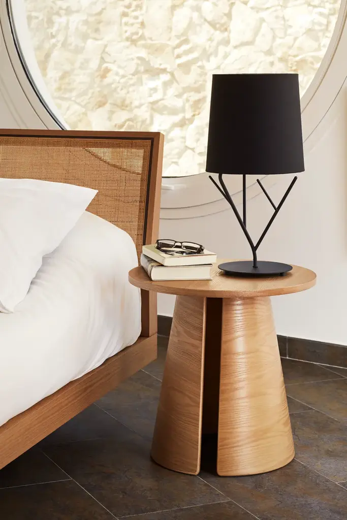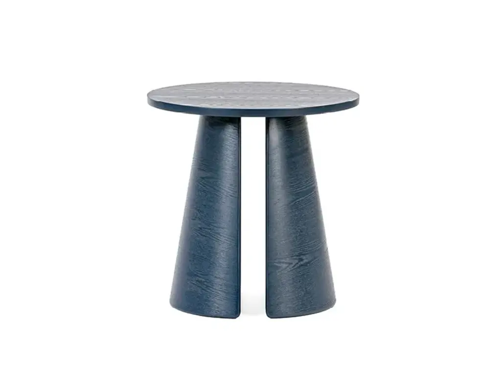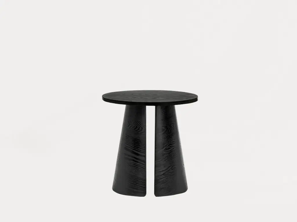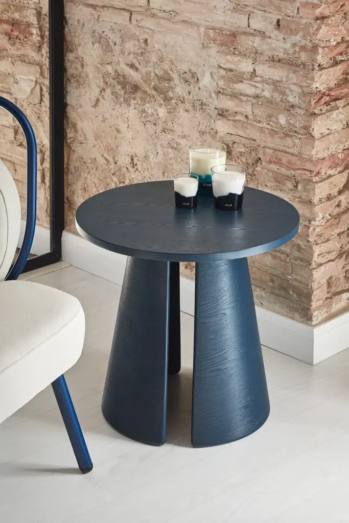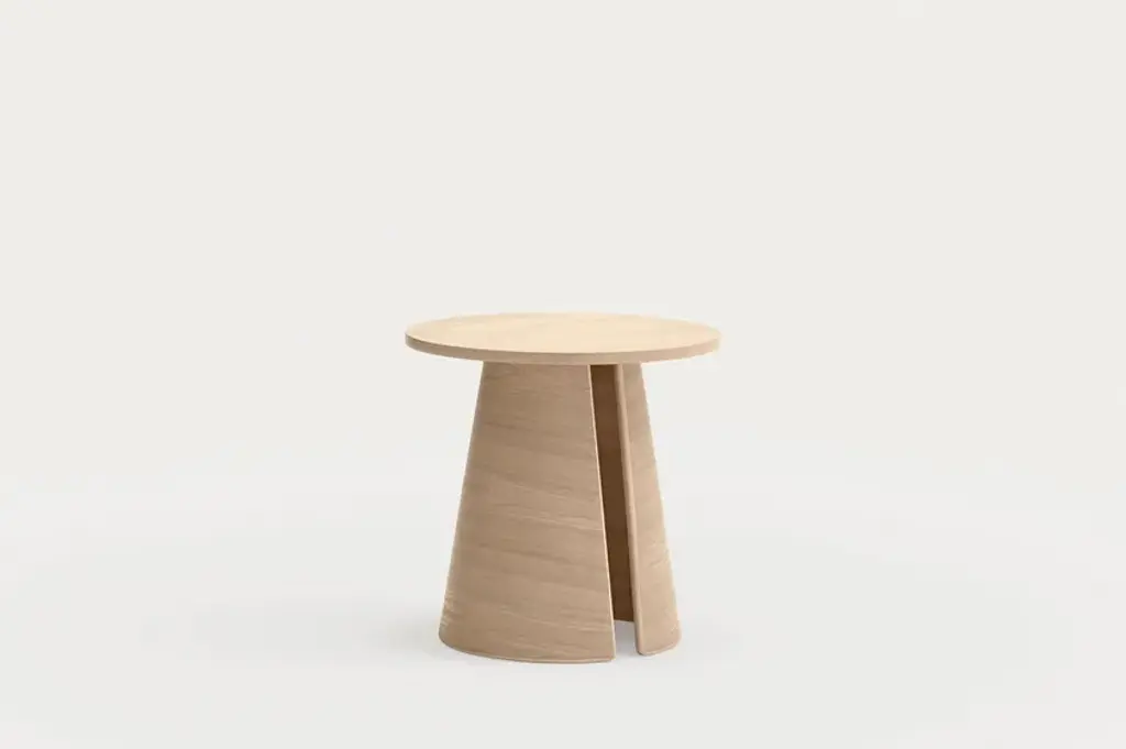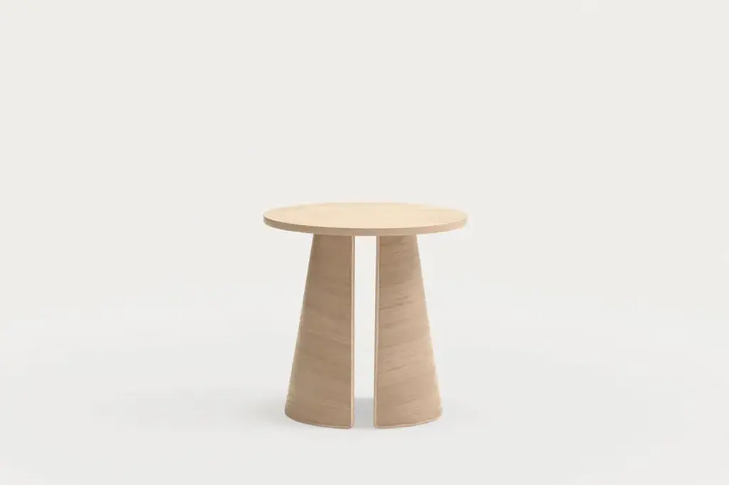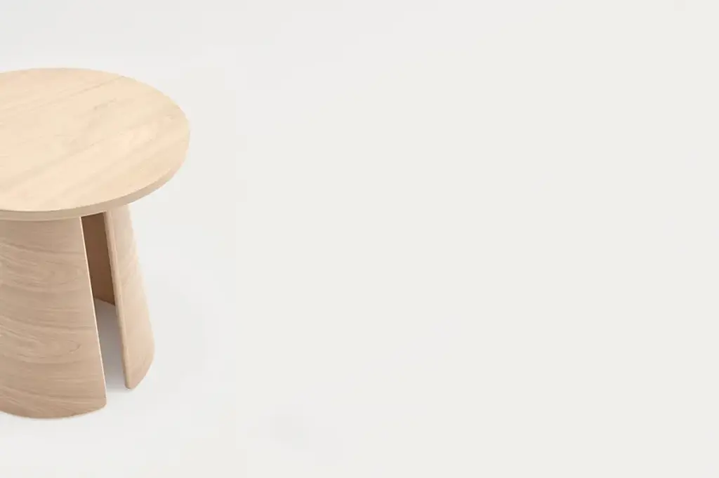 Cep is a side table with veneered top and legs. Available in natural oak color, black-stained ash wood, olive green or navy blue finishes.Cep table set, is simple and minimalist, where the outmost of the construction process of the pieces have been sought: the curved wood. With only two symmetrical parts, the base is generated on which the top board rests, creating simple tables that highlight the nobility of the wood and caring details of this collection.