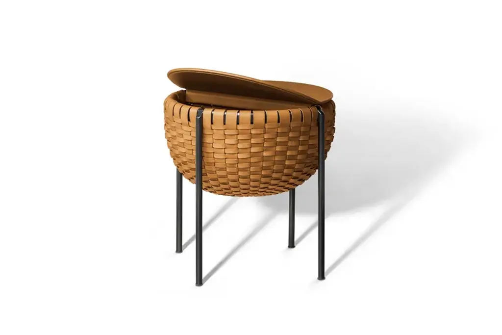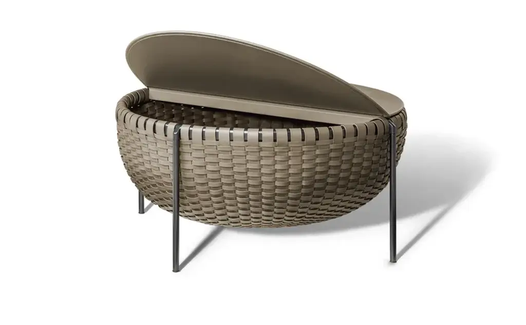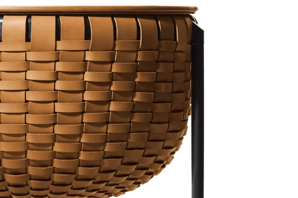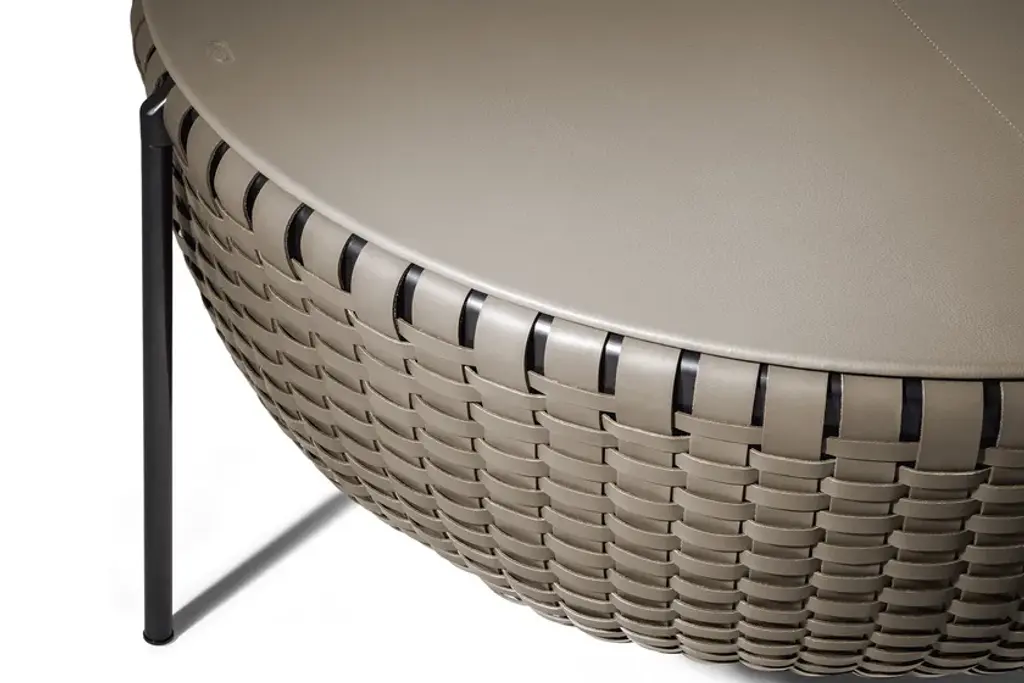 Cestlavie is a storage “basket” but also a side table. The top part, upholstered in Pelle Frau® leather, has a disk-shaped folding cover that provides access to the inside whilst also acting as a practical surface. Every detail is valuable. The interwoven strips of saddle-leather are dyed tone-on-tone, also at the edges, using techniques typically associated with the finest small leather goods. The saddle-leather is also refined on the inside surface with a transparent protective wax treatment. Galvanic treatment for the steel frame with gunmetal grey or burnished and blasted finish.Gam Fratesi took their inspiration from the traditional sewing basket when designing the modern and highly elegant Cestlavie accessories. The textural sensations of the saddle-leather and the lightness of the metal design come together in an evocative and stylish visual synthesis. Intricate processing showcases the leather culture and top-quality craftsmanship with which Poltrona Frau has always been associated. Skilfully handwoven straps of Cuoio Saddle Extra leather give form to the casing, one by one. Supported by a tubular aluminium structure, the Cestlavie storage basket appears to be suspended on slender, almost graphic, steel legs. The depth of the saddle-leather and the clean metal create interesting light effects.