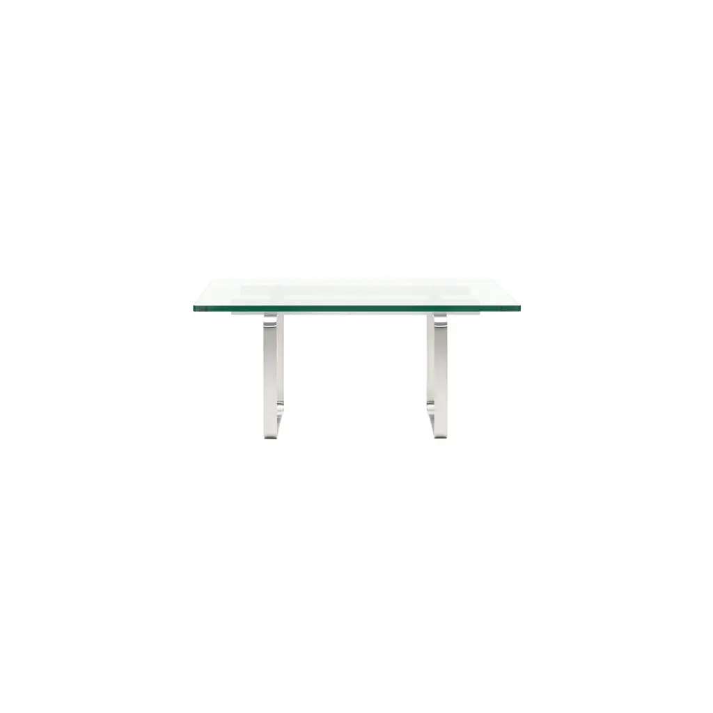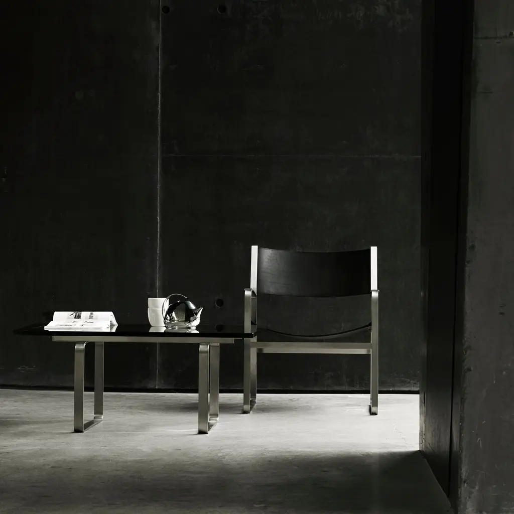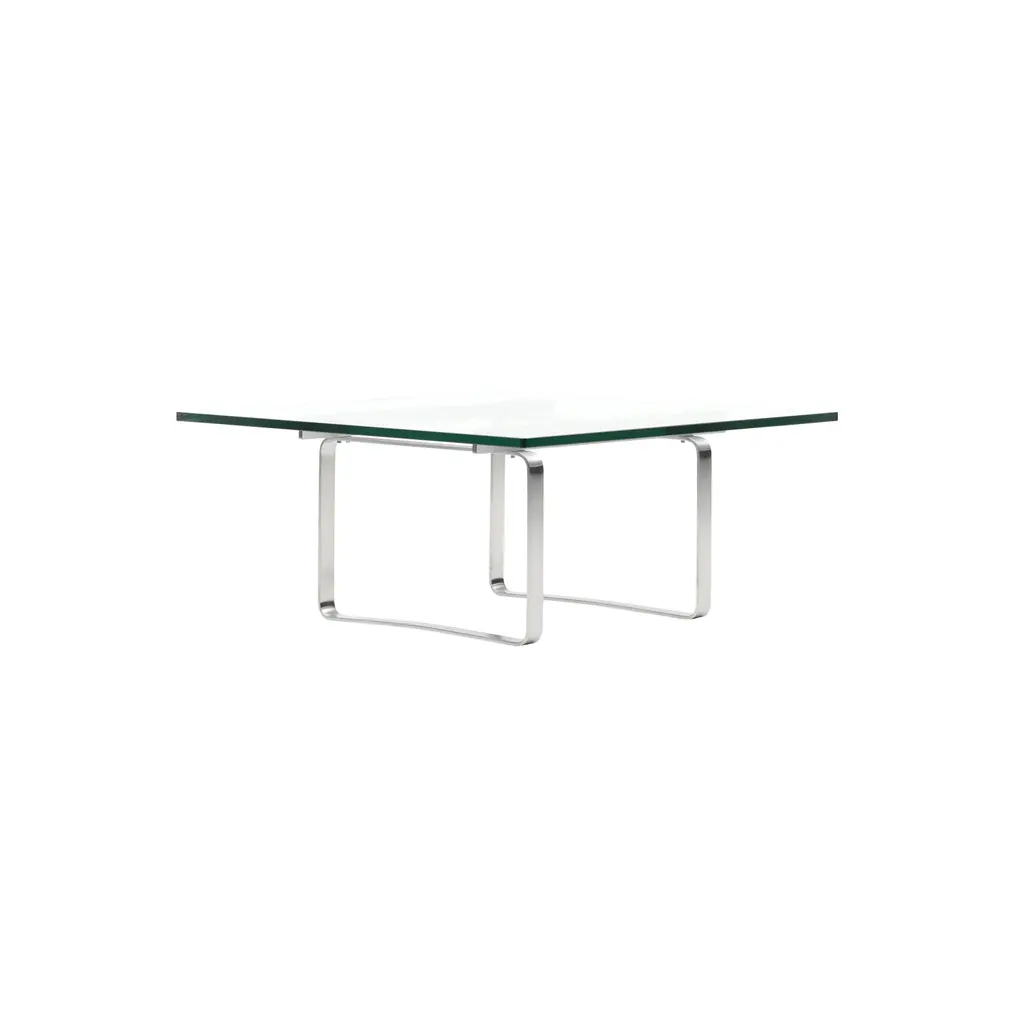From Hans J. Wegner’s striking 1970 series, the square CH106 coffee table and its rectangular sibling CH108 both feature a sturdy glass top resting on dual brushed-steel trestles connected via transverse steel rails. The characteristic bends of the frame are fully visible through the transparent surface, finding harmony with the rounded corners of the glass.