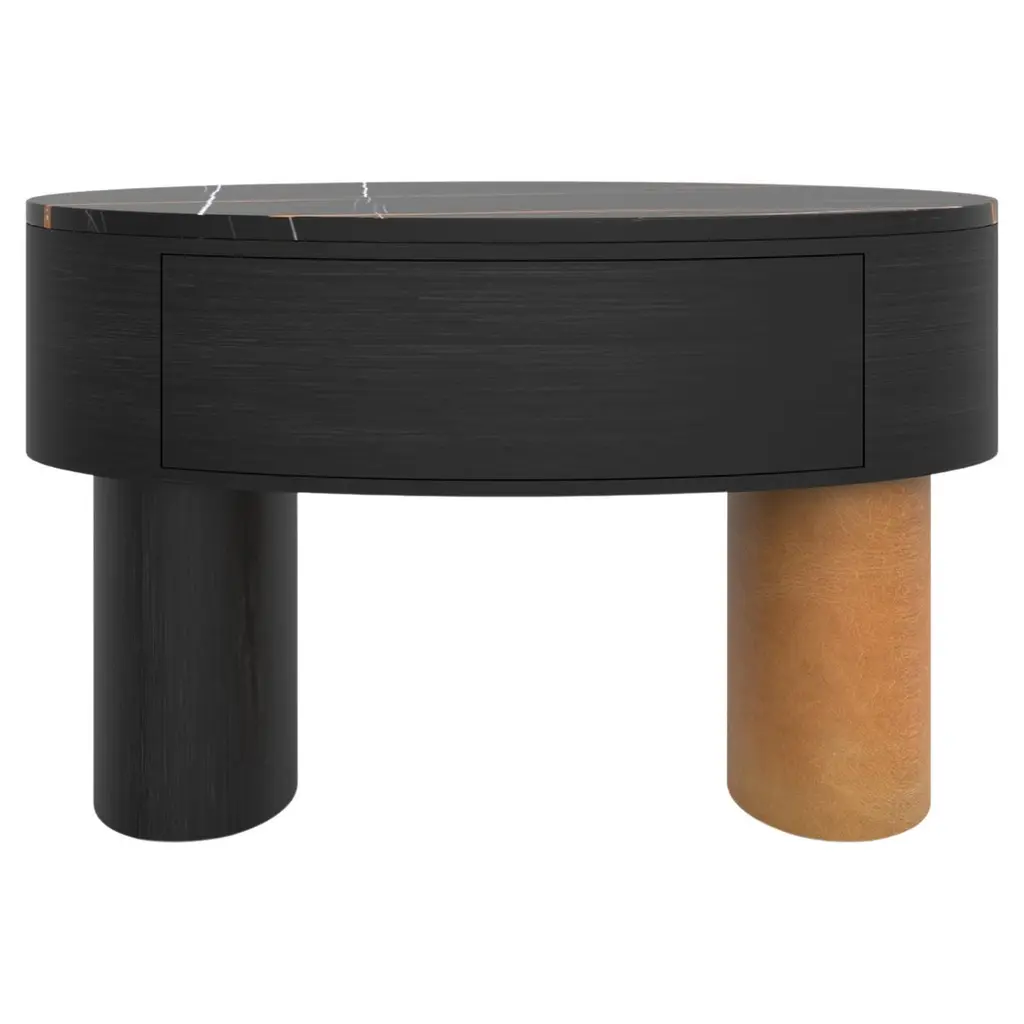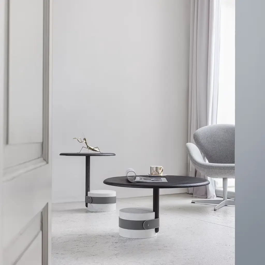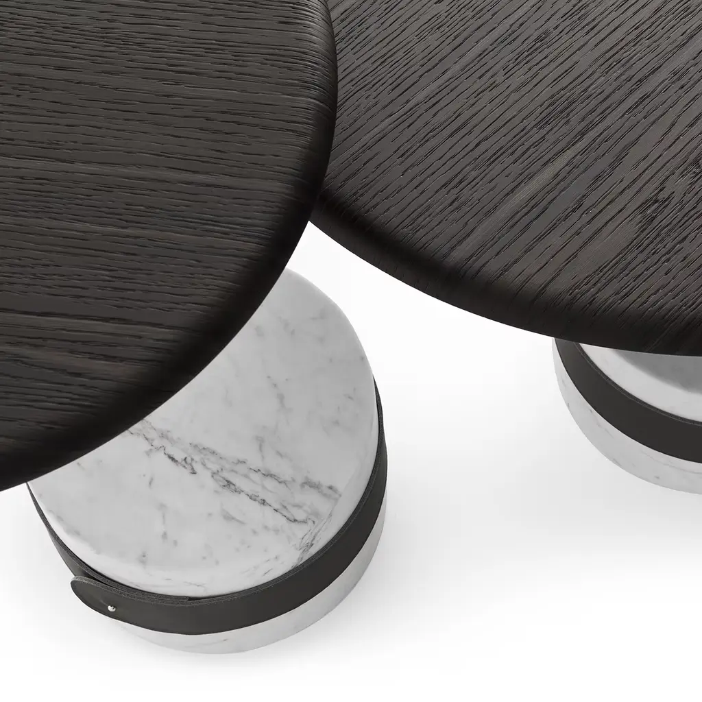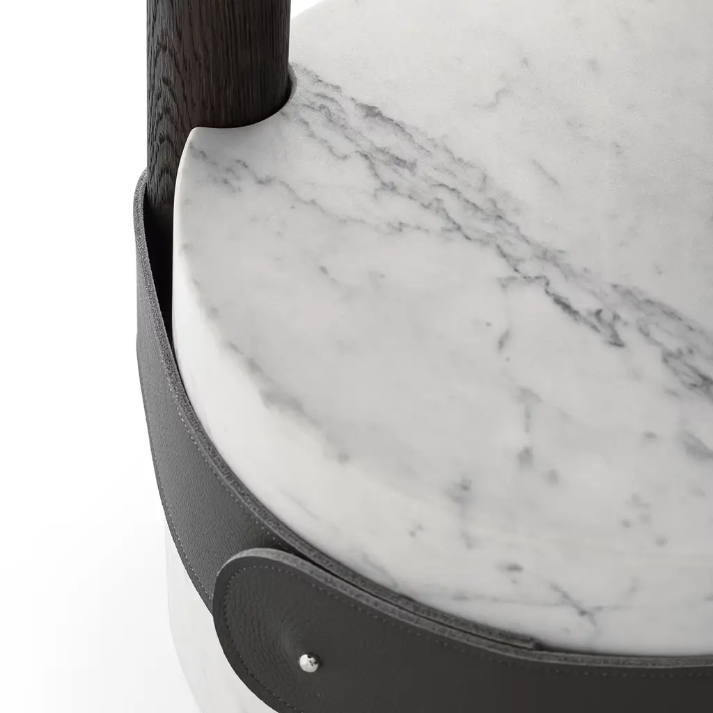 A sculptural aesthetic whimsically inspired by mushrooms marks this coffee table, an exclusive piece prized materials and geometric volumes meet. The cylindrical base in satin white Carrara marble is tied to the oak structure by means of a refined anthracite-gray leather belt, sartorial accent further harmonizing with the blunted deep-dark oak-veneered top.