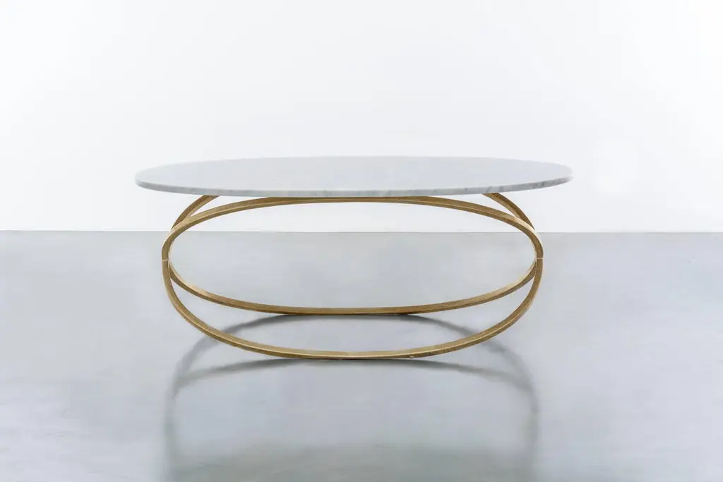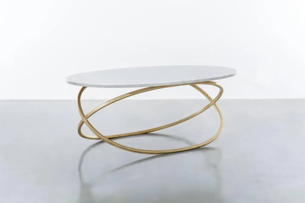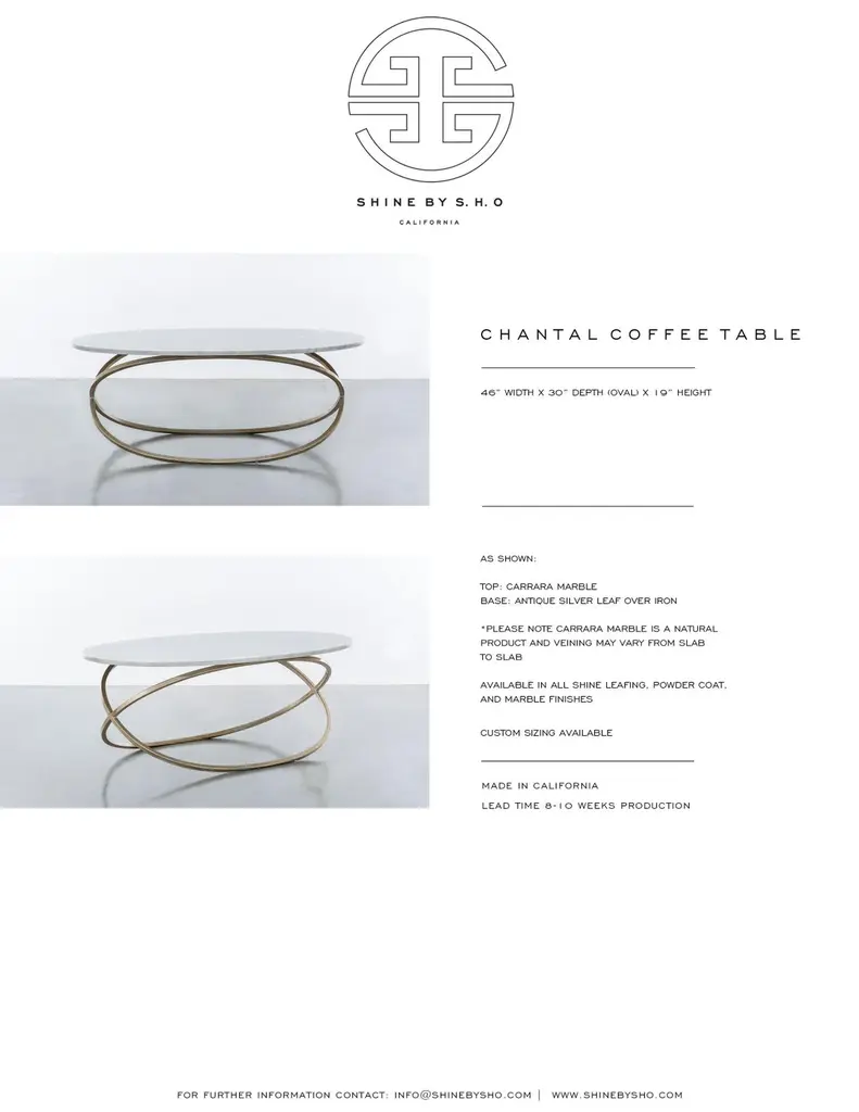 CHANTAL COFFEE TABLE - Modern Oval Cocktail Table with Carrara MarbleThe Chantal coffee table is a sleek and modern oval-shaped cocktail table that features a luxurious Carrara marble top. It is made to order in California and fully customizable to meet your specific needs.The table's design combines a contemporary aesthetic with a touch of elegance, making it a versatile piece that can fit into a range of decor styles. The oval shape of the table provides a unique and stylish look, while the Carrara marble top adds a sense of sophistication and luxury.The Chantal coffee table is available in various sizes and finishes, allowing you to customize it to fit your specific needs and style preferences. Whether you prefer a sleek and minimalist look or a more elaborate design, this table can be tailored to your liking.Overall, the Chantal coffee table is a statement piece that is sure to add a touch of elegance and style to any living space. Its modern design and high-quality craftsmanship make it a durable and functional addition to your home.