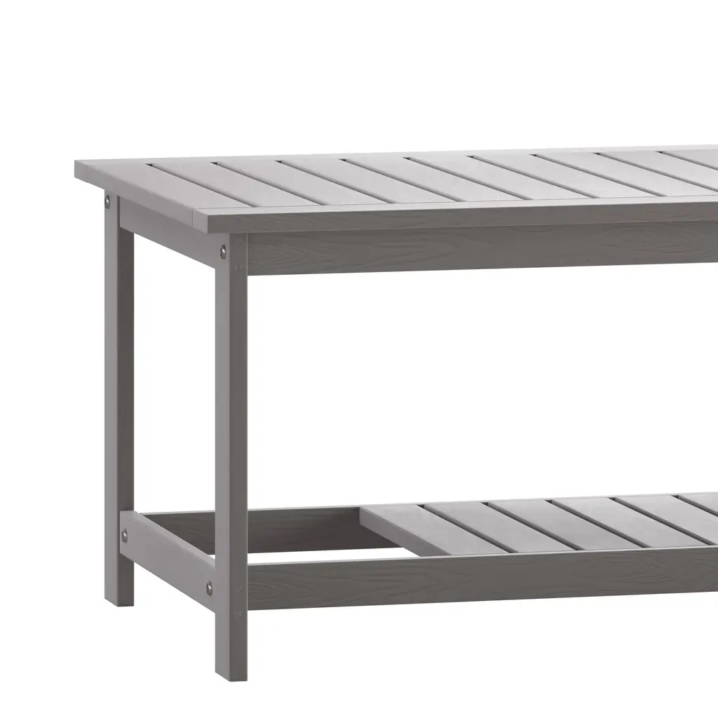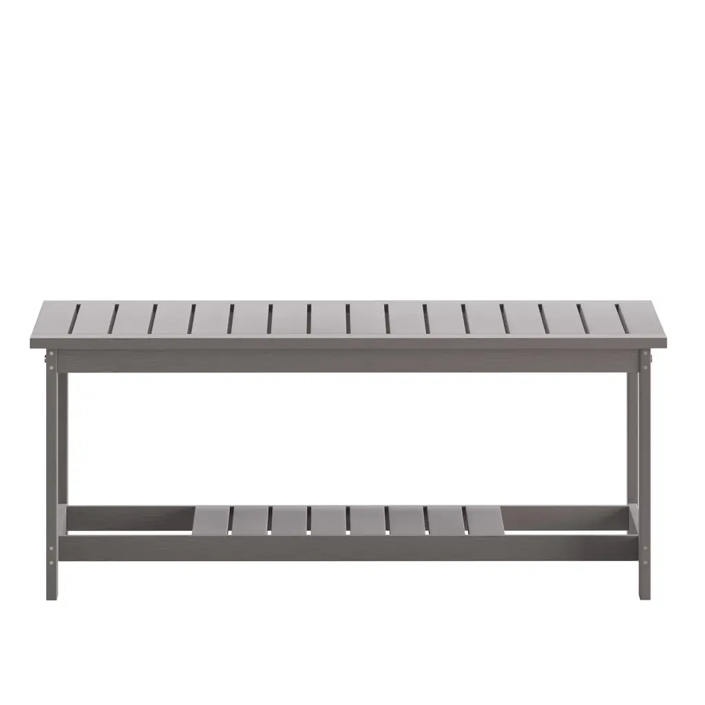 Give your outdoor seating a cohesive look while adding much needed storage with the classic look of this commercial grade 2 tiered adirondack style poly resin coffee table. Constructed from weather-resistant polystyrene, this indoor/outdoor table is more durable than plastic and won't chip, splinter or peel but is lightweight and easily portable making it perfect for the hospitality industry. Stainless steel hardware securely joins all pieces of this poly resin table allowing it to hold up to 200 lbs. static weight capacity. Exemplary weather resistance and a slatted design that aids water drainage make this patio furniture table an ideal piece for decks, patios, or poolside to hold drinks, snacks, or your latest read with ease. Assembly takes less than 10 minutes for your convenience. Pair this poly resin patio table with other pieces in our collection for the complete set up.