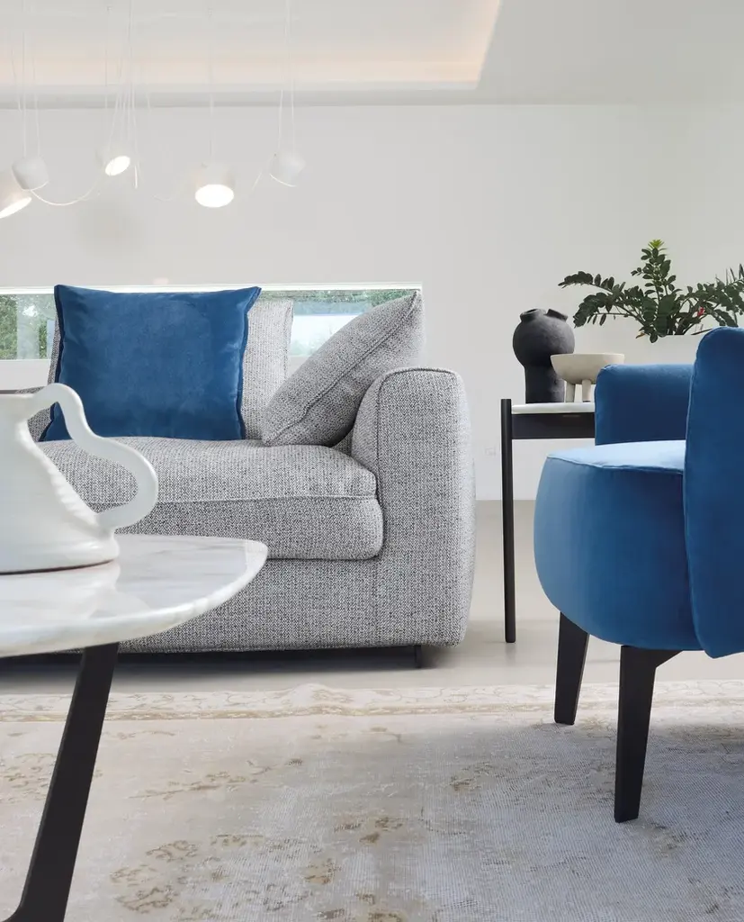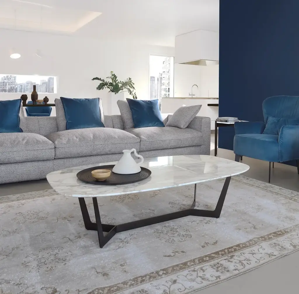 Charme - A collection of side tables featuring a bold and light look thanks to the metal base in finishes - painted dark bronze anodized and painted gold satin finish - that supports treamlined original Calacatta marble, Emperador marble, Portoro marble,Sahara noir marble and painted ash veneer tabletops.