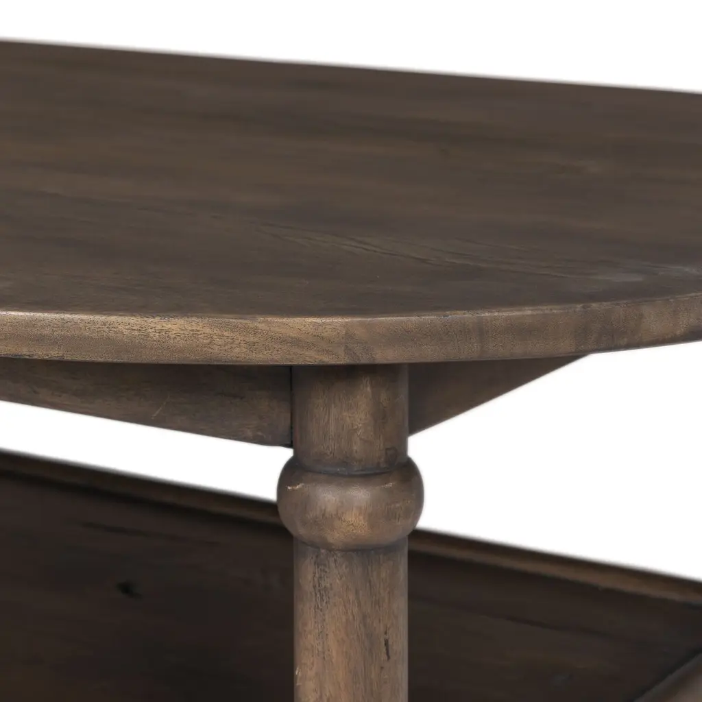Crafted from reclaimed wood enriched with natural antiquing. A rounded bullnose edge and the lower shelf add functionality, while the round ball details provide a crafted finish.