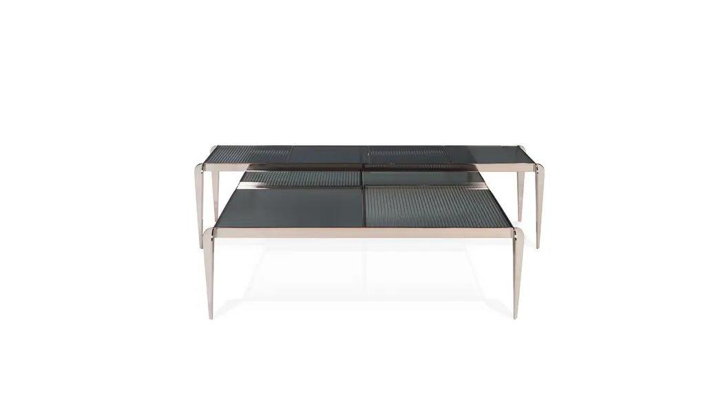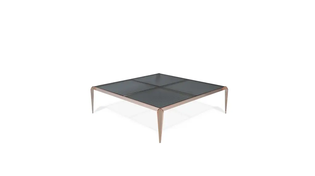 Checker is a set of cocktail tables, end tables and a console that call to mind a checkerboard. The tops feature reeded glass squares. They sit on a gracious metal base that confidently protrudes from the frame.