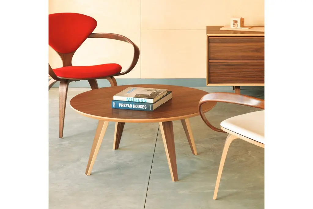 The latest addition to the Cherner table collection. The coffee table comes in two sizes in Natural or classic Walnut. Molded plywood base with a 1? profiled exposed edge tabletop.