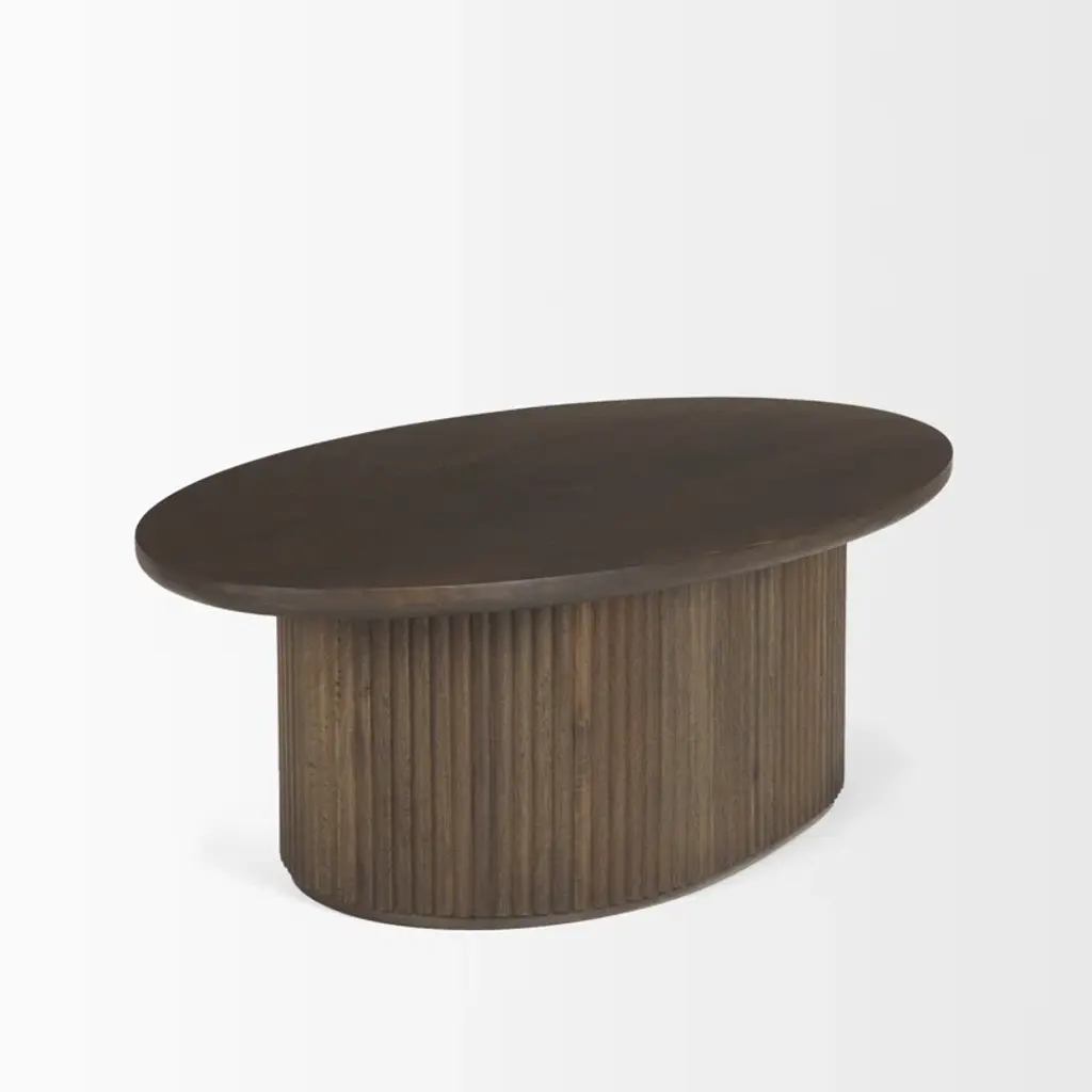 Bold and refined storage for your living room essentials. Our coffee table shows off a dynamic, curved silhouette with a warm finish for a hint of rustic charm. The kiln-dried solid wood frame reveals a sandblasted texture, while a fluted pedestal base creates even more dimension to the piece. The oval top opens with help from a hydraulic lift, offering easy access to blankets and board games.