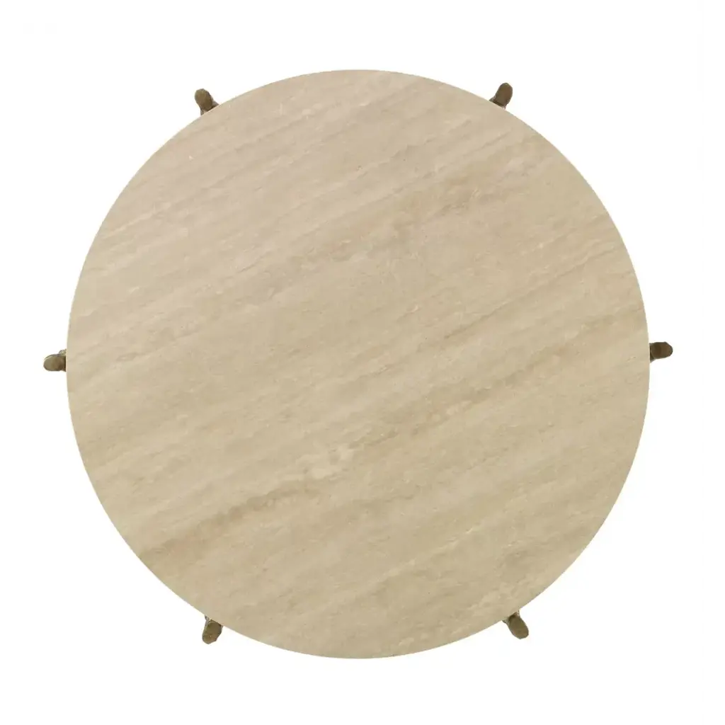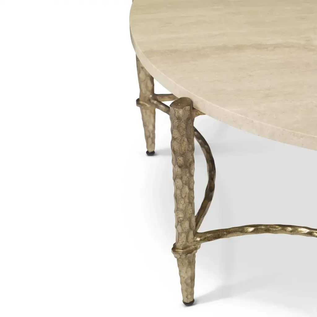 Decorative frame and legs are made of hand forged iron with an antique silver metal leaf finish. Travertine stone top.