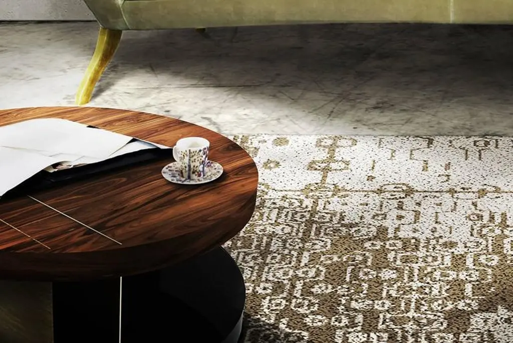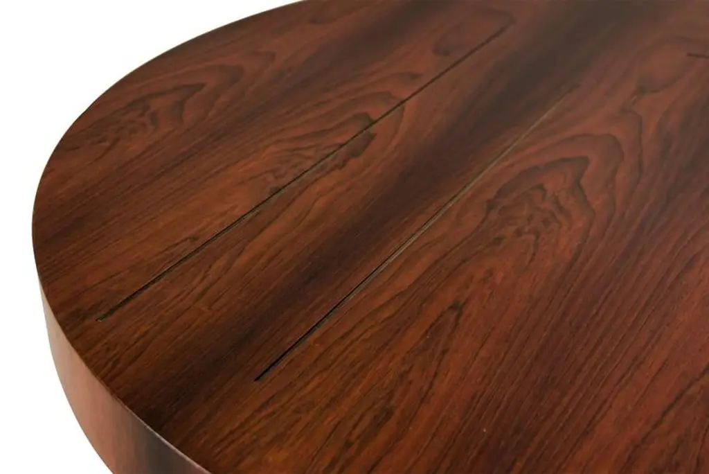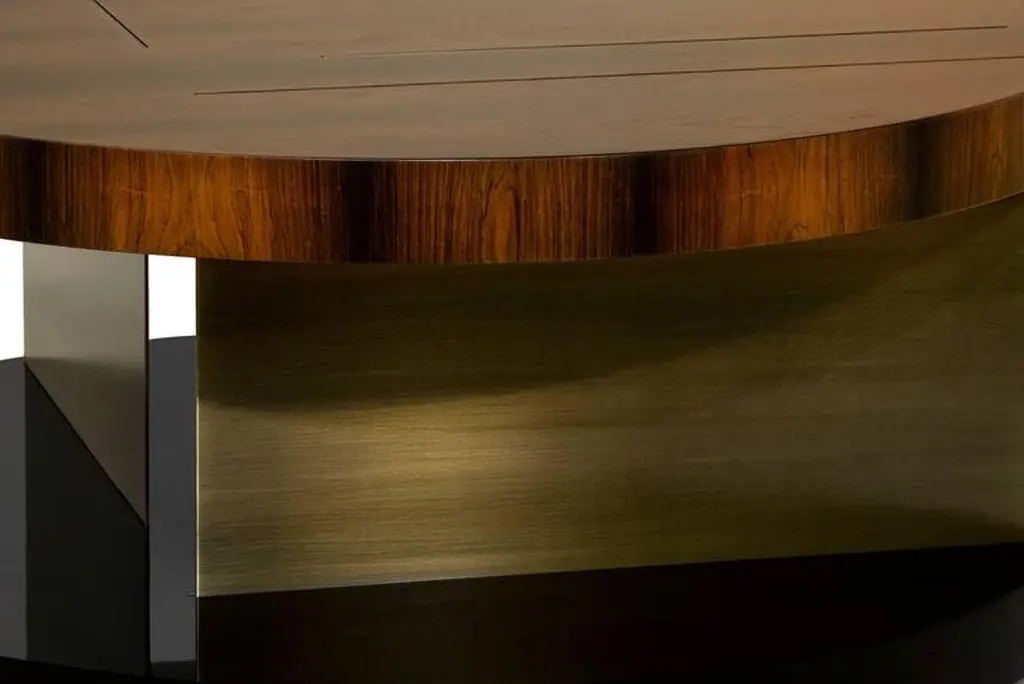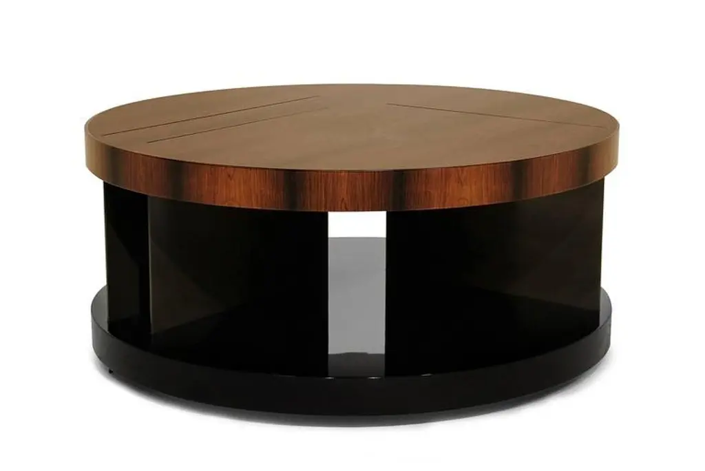 Coffee Table Chloe Round with wooden top and base structure, upper top covered with matte Pau Santo woodveneer and coffee table's base made in lacquered high glossy finish. Center of the table base made in solid brass in antique brass finish.