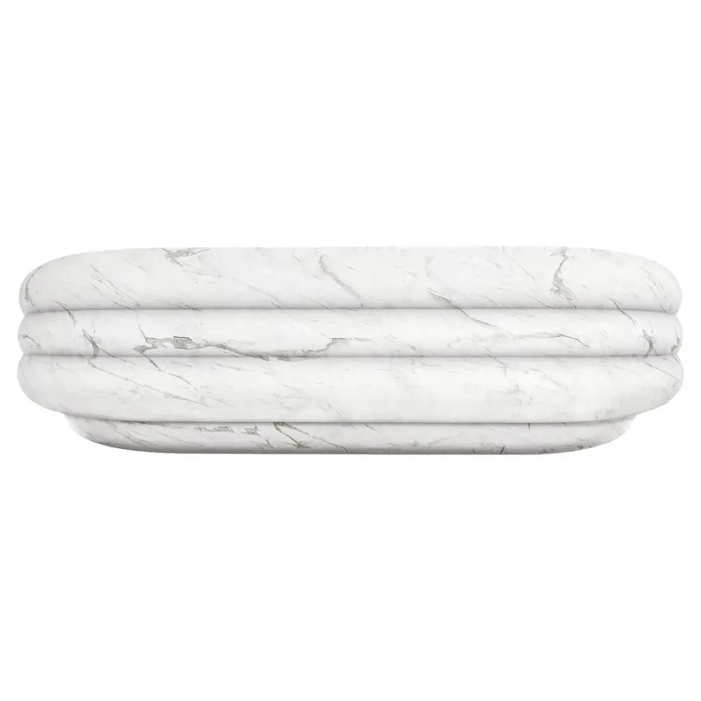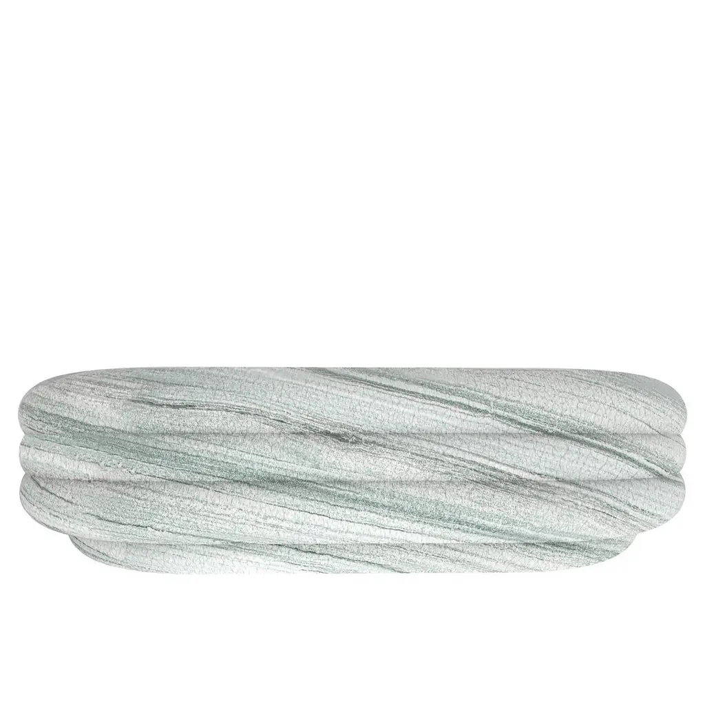 Chloe Vert D'Estours Marble Coffee Table by Fred and JuulDimensions: D 72 x W 120 x H 30 cm.Materials: Vert D'Estours marble.Available in White Carrara, Vert d'Estours, black Marquina and pink Portugal marble options. Custom sizes, materials or finishes are available. Please contact us.In ancient Rome and Greece figures of divinities were sculpted in marble and so is this modern-day coffee table inspired by bodily curves. Carved from a solid block of marble, the voluptuous silhouette and silky honed surface of the oval shape invite you to touch and use it. Here depicted in three different marbles - Pink Portugal, a limestone that can only be found in the Portuguese Alentejo area. Its shades of pink and the amount and color of its veins varies greatly, hence the extreme uniqueness of each extracted block. Black Marquina, a Spanish calcite stone of such an intense black color that it resembles a dark night sky occasionally illuminated by the alternation of bright white veins and fossils. Vert d’Estours, a material known and appreciated since the nineteenth century, when it was used in the palace of Versailles. This very compact crystalline limestone with thin green veins on an ivory background is extracted from the only existing quarry, located in the south of France.Fred&Juul, short for Federico Minarelli and Julie Janssen, are two architects who decided working as architects isn’t for them. It was when designing custom furniture for their clients and developing it with the amazingly skilled local artisans that they truly found joy in their work. So, in 2012 they decided to solely focus on that and launched their first lighting and furniture collection. With the exception of the renovation of the old Tuscan farmhouse that would become their home and studio, a labor of sorrow, but mostly love (see the result on the press page!).What sets them apart is how they see and use their materials of choice: bronze, brass, wood and stone. Their designs value the inherent nature of these materials and how they are meticulously crafted, like the grainy, clouded surface of their Raffaele light in sandcast brass or the juxtaposed Oak grains in the marquetry of their Maurits table. Starring all these aspects in the story of a piece, is what makes it unique and last.Over the years they have increasingly worked with interior designers on custom pieces for high end projects all over the world, thanks to their attention for detail, refined aesthetic sense and collaboration with the best highly specialized craftsmen Tuscany has to offer.