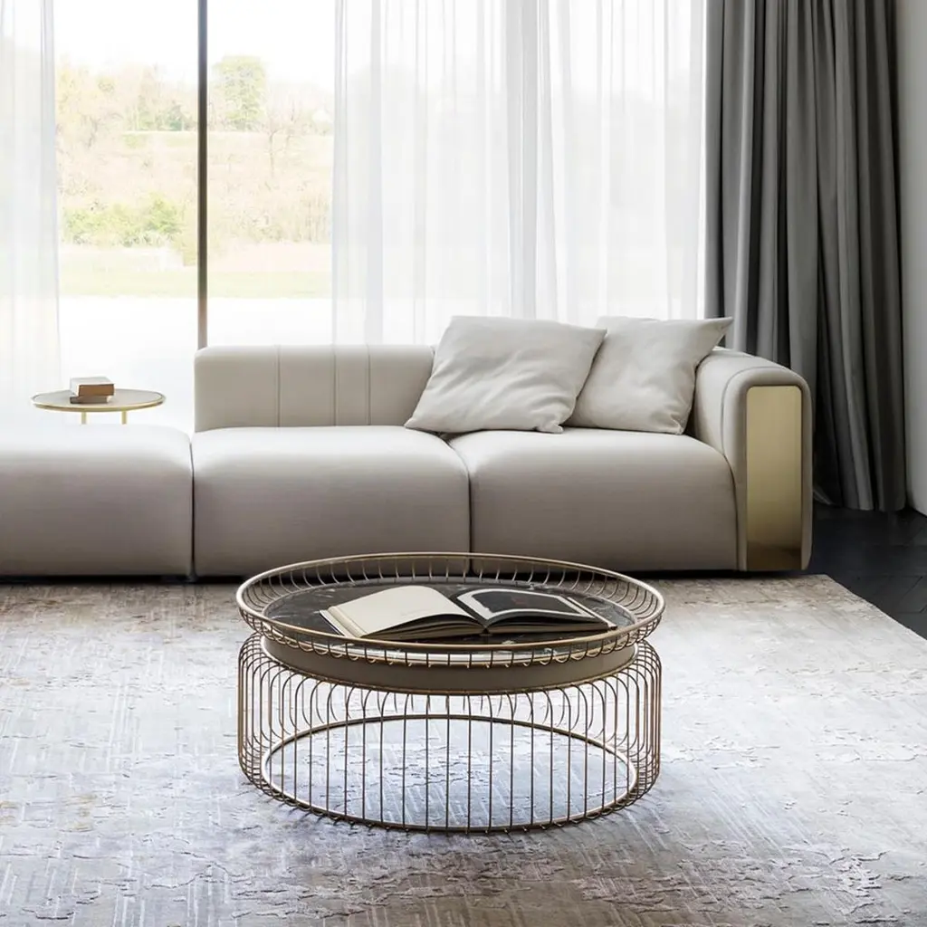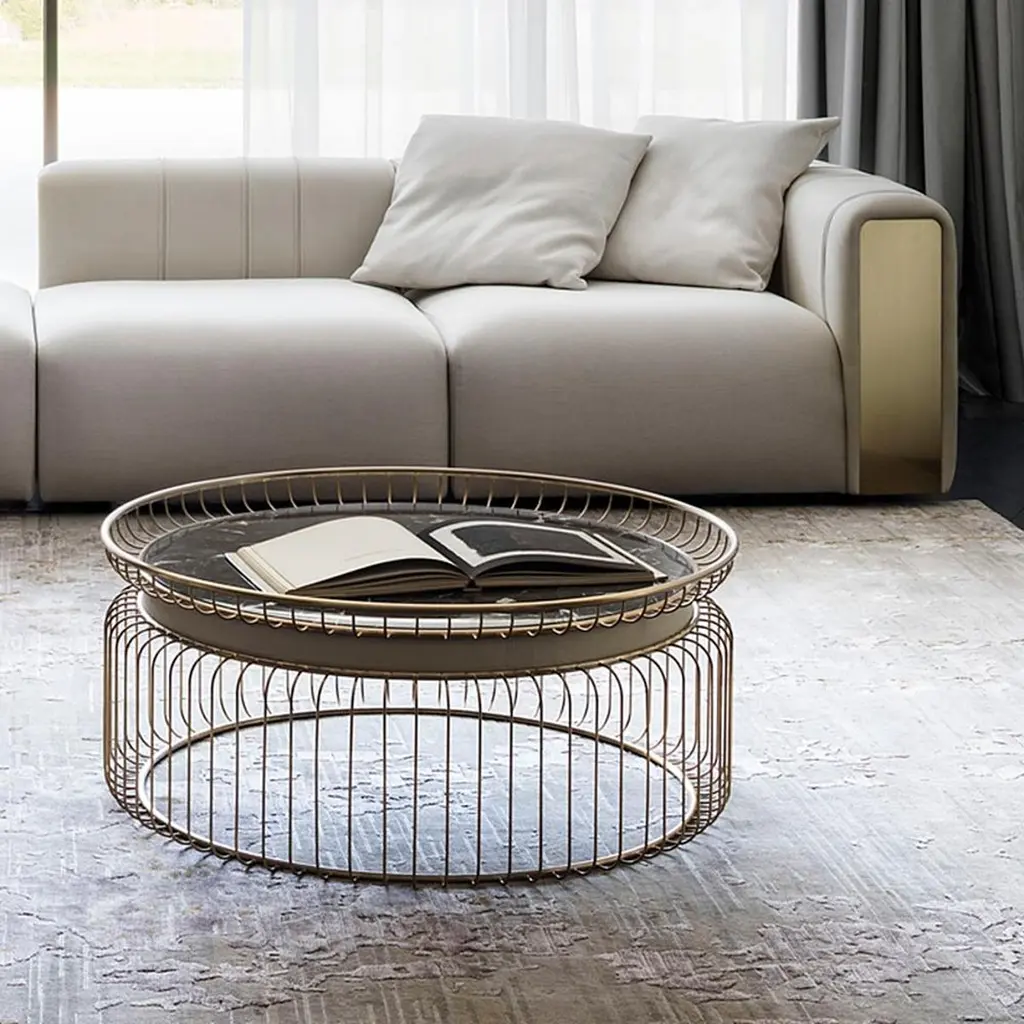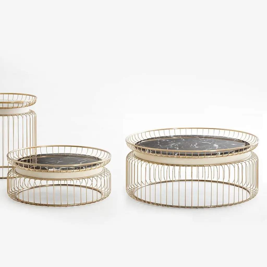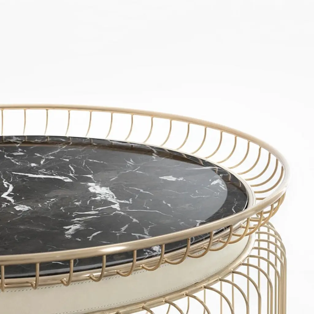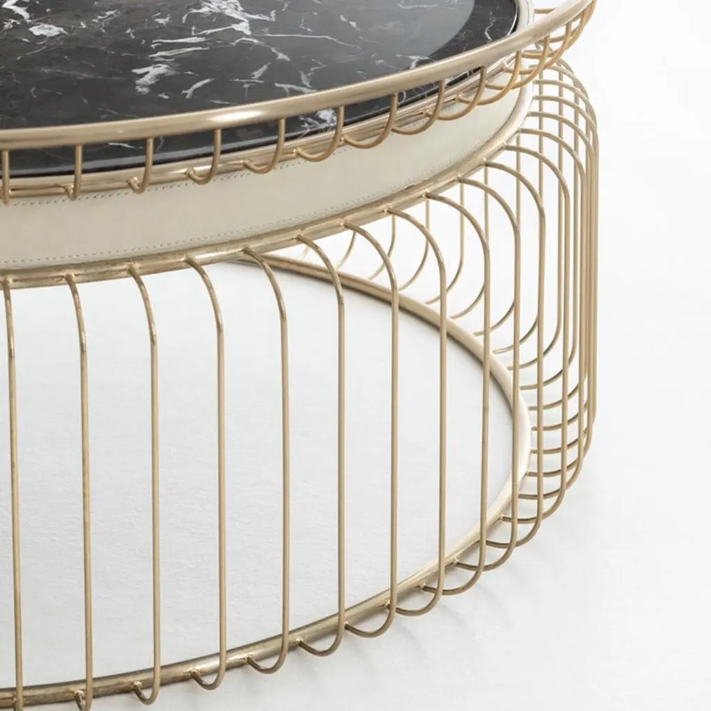 Coffee table Cigala with structure in stainlesssteel in gold finish with a black round emperadormarble top. With white genuine leather trim belowto the top.