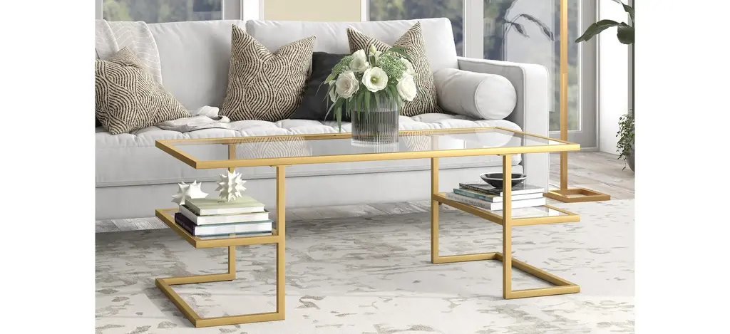 Form meets function in the design of the modern contemporary Circe Coffee Table. The two floating side shelves create extra storage possibilities, leaving plenty of open space beneath the tabletop to tuck away an ottoman or set of poufs. Crafted from durable steel and tempered glass, this table's geometric lines create an eye-catching centerpiece in your living space.