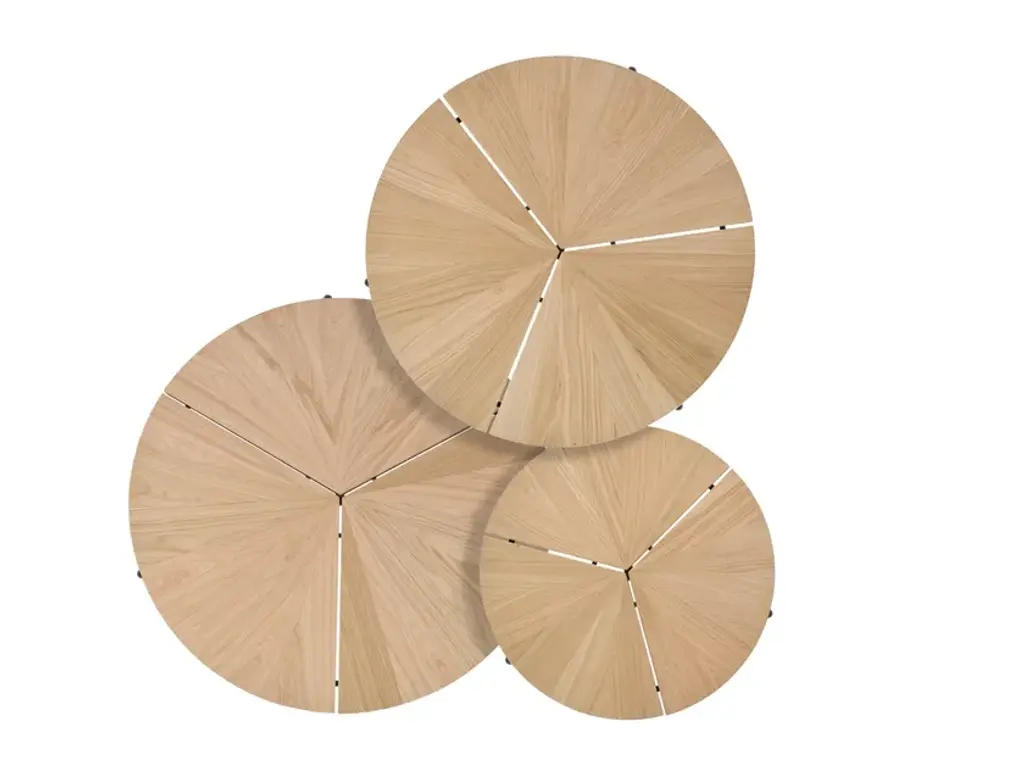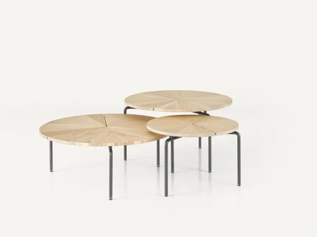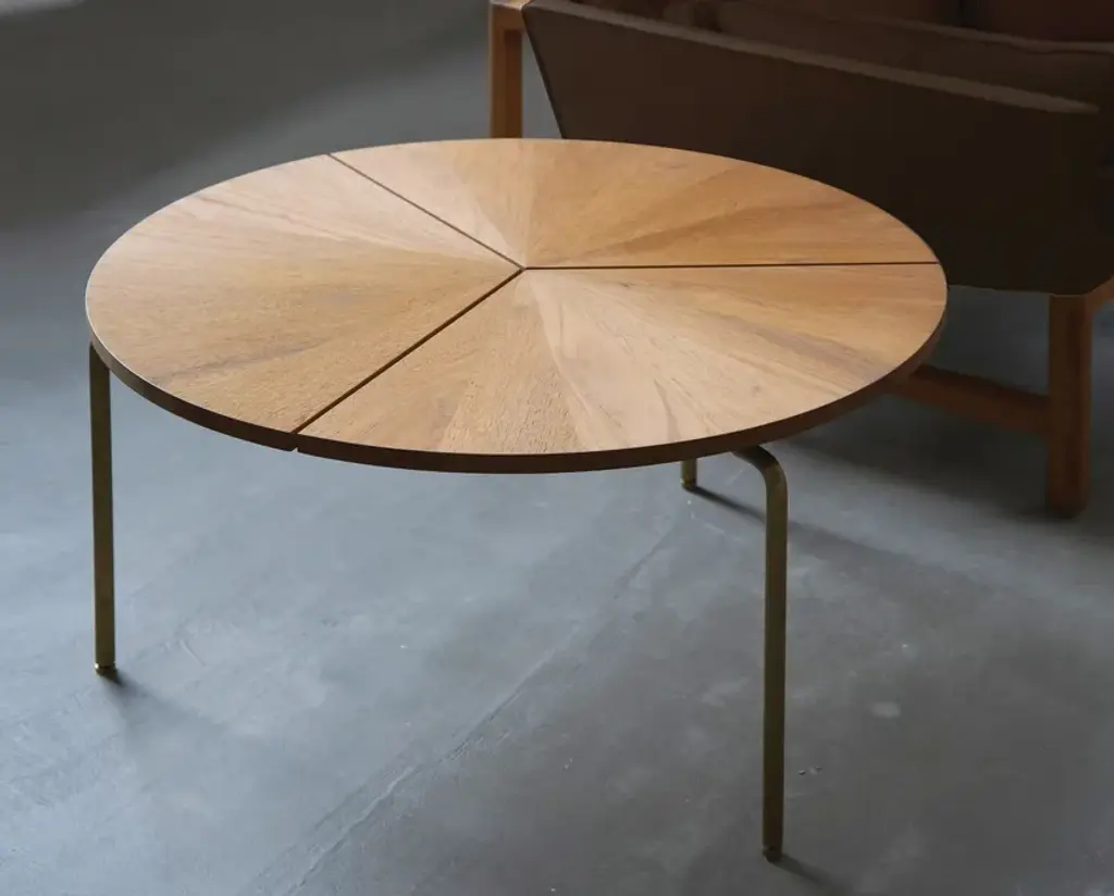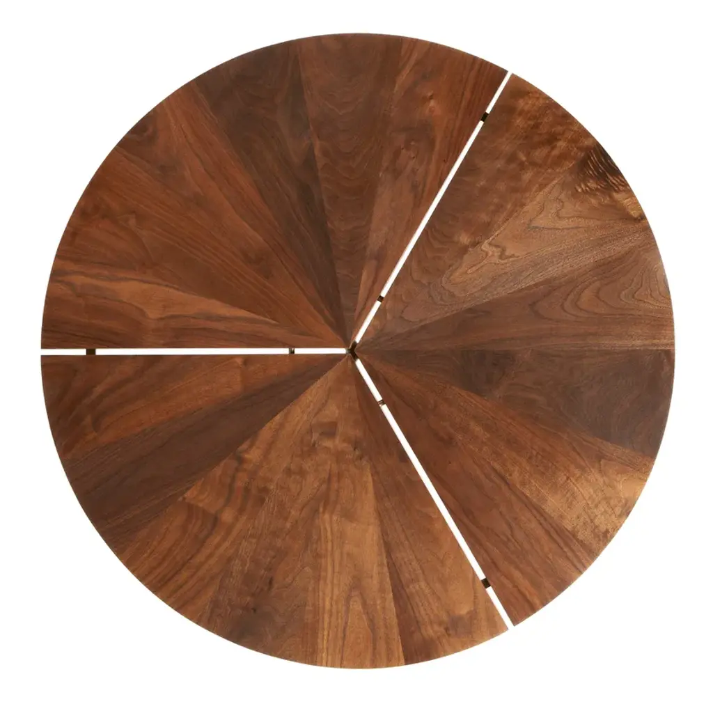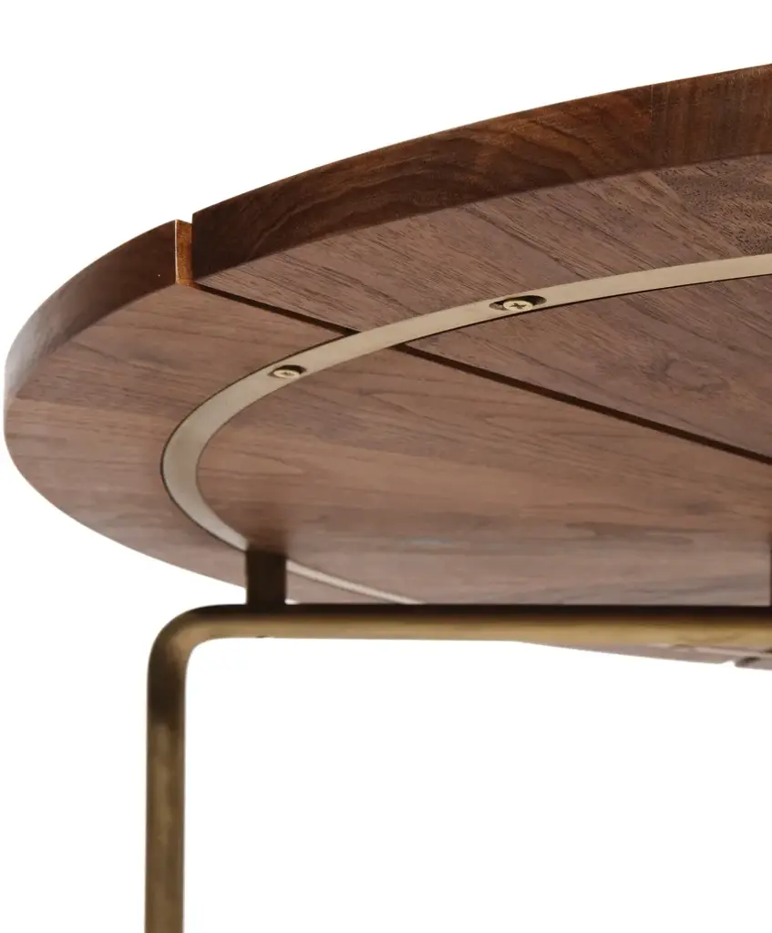 The Circular Coffee Table is a solid wood occasional table with a base in solid stainless steel, or nanoceramic coated solid stainless steel. The table can be used in covered outdoor environments in appropriate woods. Materials: Solid Walnut, Oak, Ash or Ebonized Ash. Base Options: Solid stainless steel or Satin Nickel, Bronze, Satin Brass, or Gunmetal nanoceramic coated solid stainless steel.The Circular Table Collection marries pure geometry with high craft, resulting in a simple but elegant circle engineered in solid wood. Originally conceived as a durable everyday table that could be used both indoors and out, the smartly proportioned piece epitomizes BassamFellows contemporary ‘Craftsman Modern’ ethos. From above, the piece emanates a strong geometric identity given that the circle is divided equally into wedge shapes with the grain of the wood radiating from the center. The table top is cut into three equal segments separated by a reveal. The reveal allows the pie-shaped solid wood wedges to move freely with variations in humidity eliminating warping and splitting. A sturdy but agile floating presence is created by the table’s base, made from circular sections of tubular stainless steel. All joints are invisible. The tabletop is connected to the base with circular stanchions further adding to the table’s lightness. In Teak or Iroko, the table also works well in covered outdoor environments.