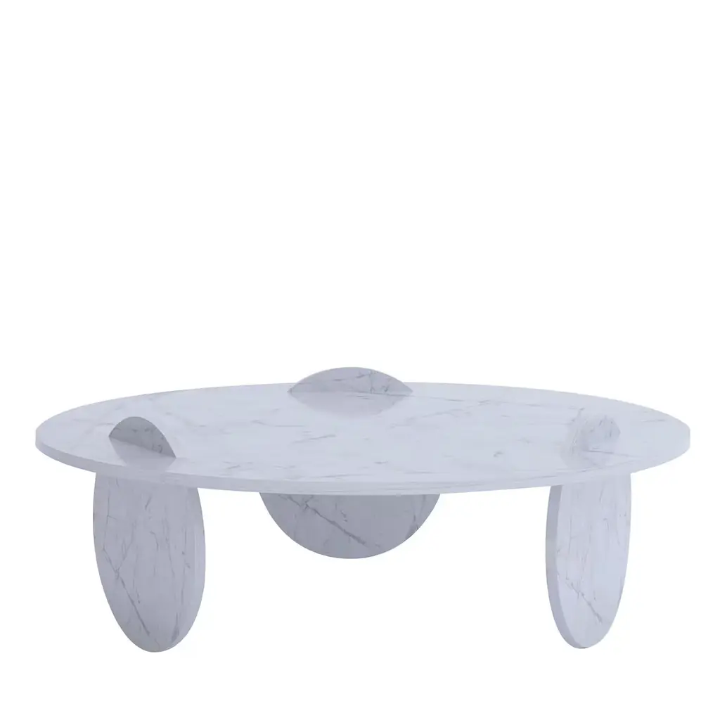 Archetypal volumes cleverly arranged to maximize its sculptural flair distinguish this one-of-a-kind coffee table entirely fashioned of prized Azul Macaubas marble. Three disks, playing a crucial structural function, pierce the top, a captivating intersection that further stresses its geometric inspiration. Superb for exclusive contemporary decors.