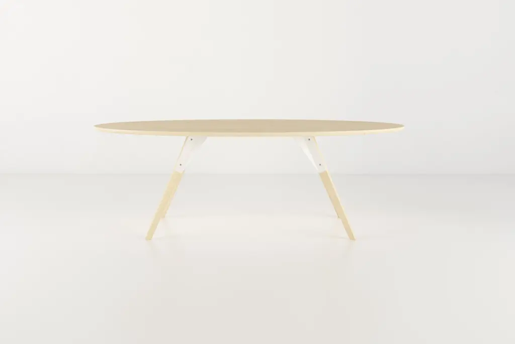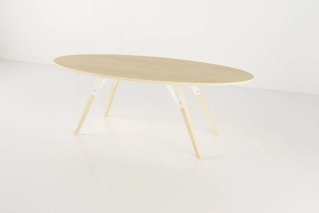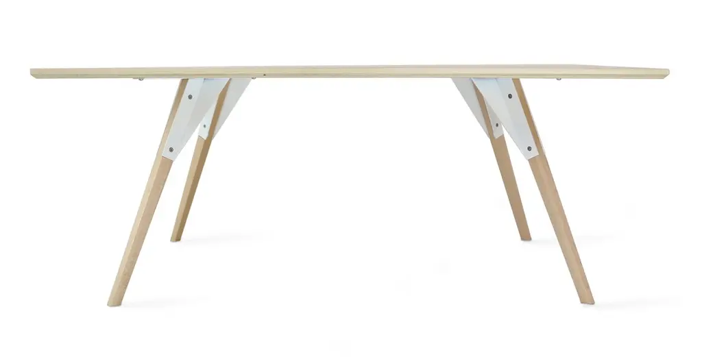 The Clarke Collection comes in ten different table top sizes, two wood species, and two metal finishes. The exposed stainless steel bolts blur the line between Scandinavian and Industrial styles.