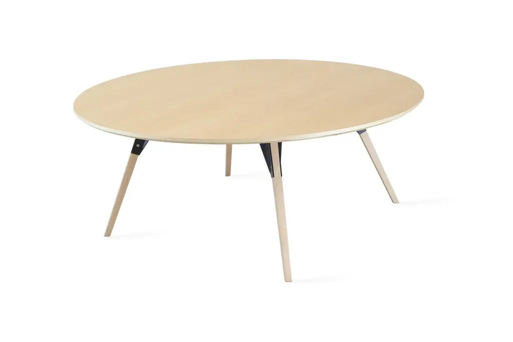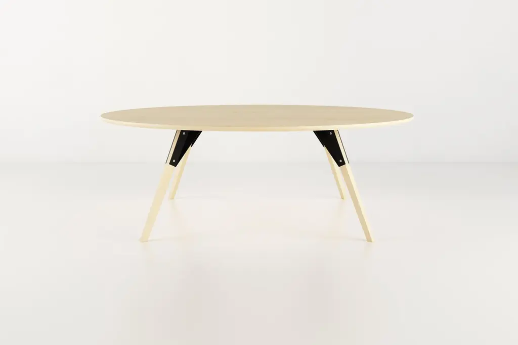 The Clarke Collection comes in ten different table top sizes, two wood species, and two metal finishes. The exposed stainless steel bolts blur the line between Scandinavian and Industrial styles.
