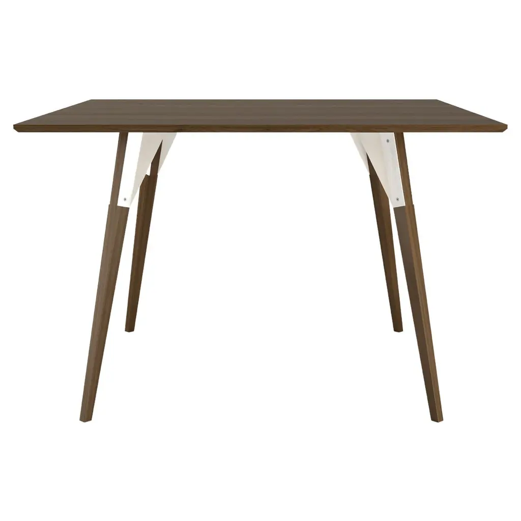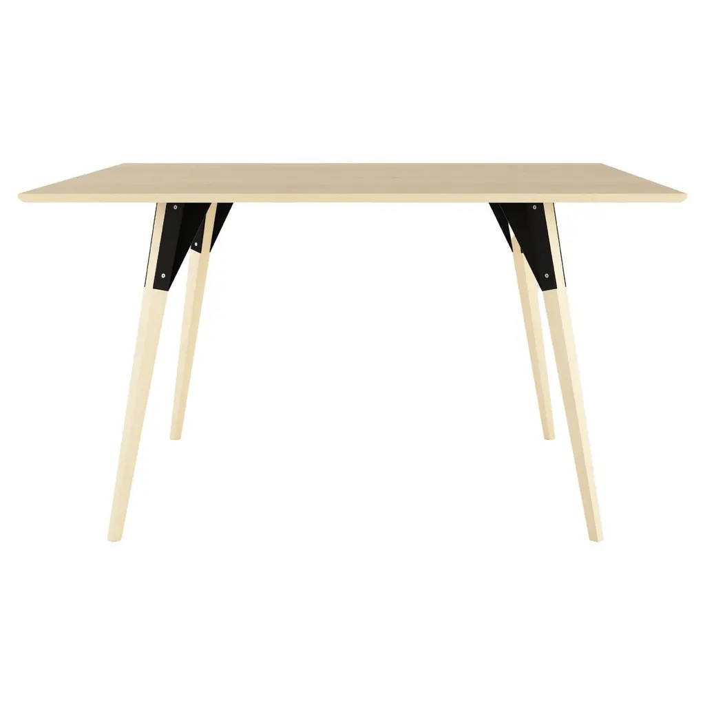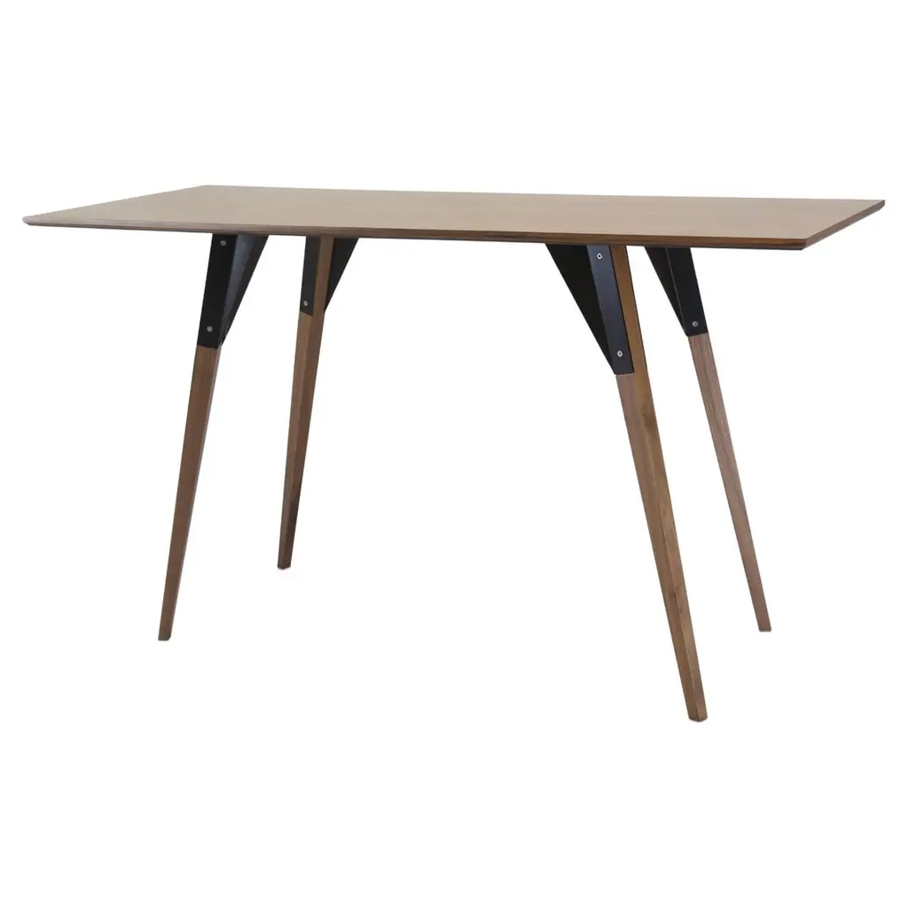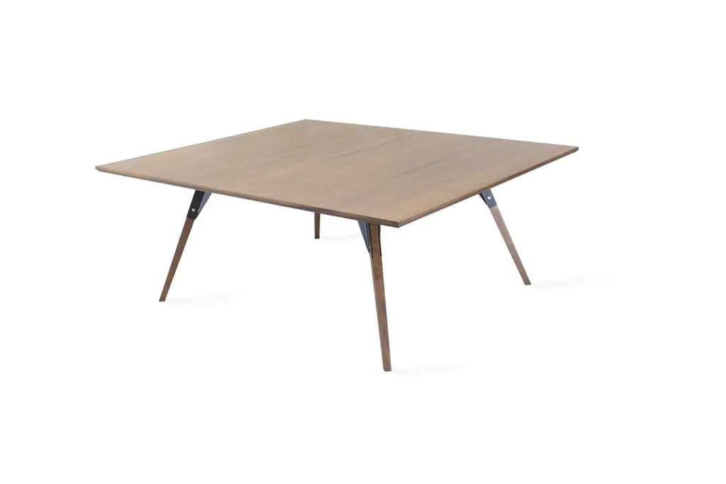 The Clarke Collection comes in ten different table top sizes, two wood species, and two metal finishes. The exposed stainless steel bolts blur the line between Scandinavian and Industrial styles.