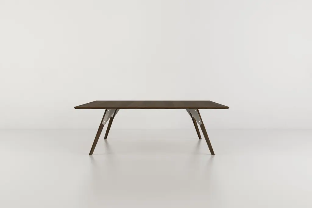 The Clarke Collection comes in ten different table top sizes, two wood species, and two metal finishes. The exposed stainless steel bolts blur the line between Scandinavian and Industrial styles.