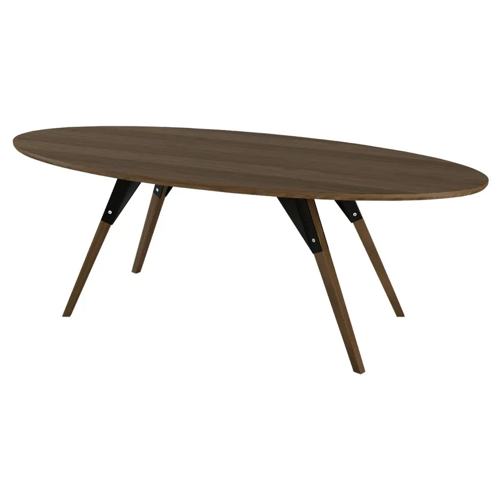 The Clarke Collection comes in ten different table top sizes, two wood species, and two metal finishes. The exposed stainless steel bolts blur the line between Scandinavian and Industrial styles.