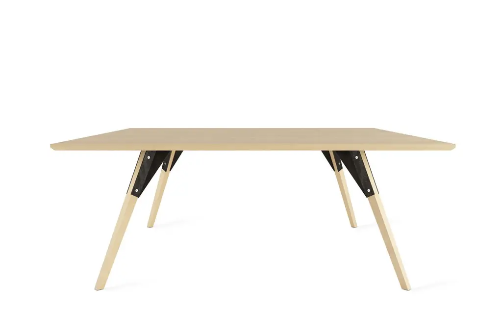 The Clarke Collection comes in ten different table top sizes, two wood species, and two metal finishes. The exposed stainless steel bolts blur the line between Scandinavian and Industrial styles.