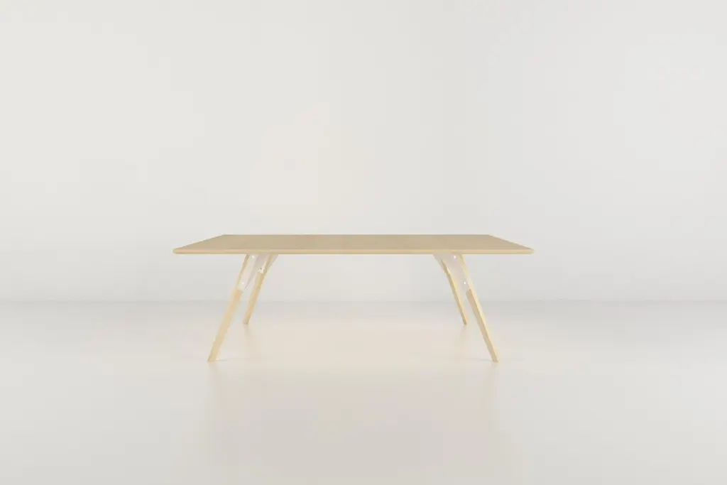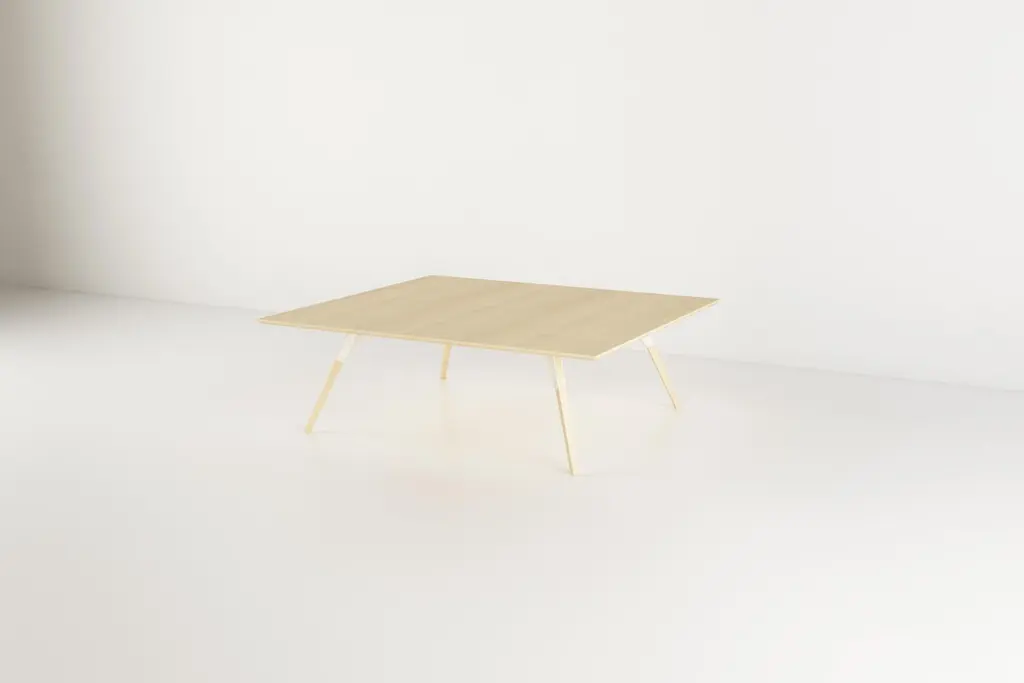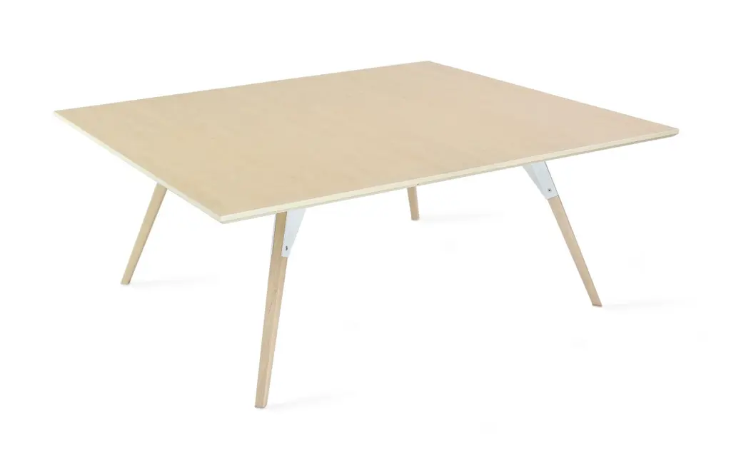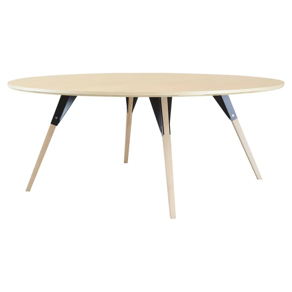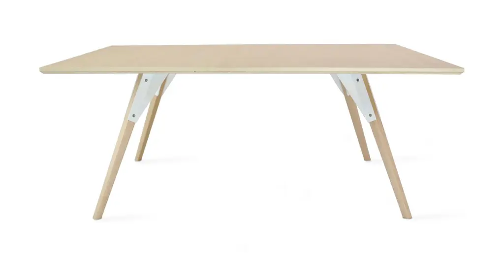 The Clarke Collection comes in ten different table top sizes, two wood species, and two metal finishes. The exposed stainless steel bolts blur the line between Scandinavian and Industrial styles.