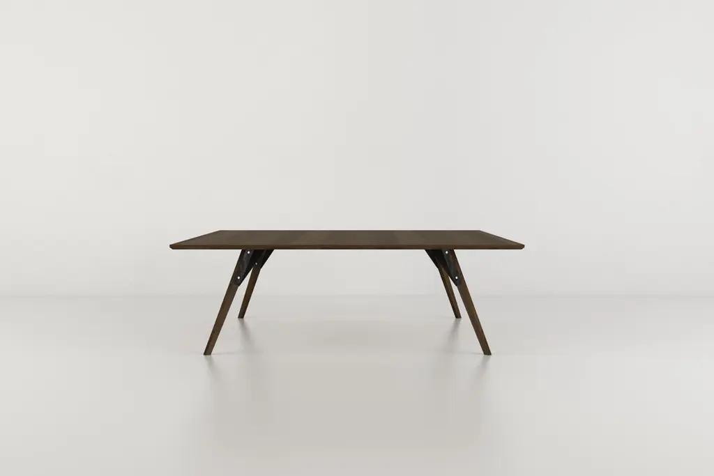 The Clarke Collection comes in ten different table top sizes, two wood species, and two metal finishes. The exposed stainless steel bolts blur the line between Scandinavian and Industrial styles.