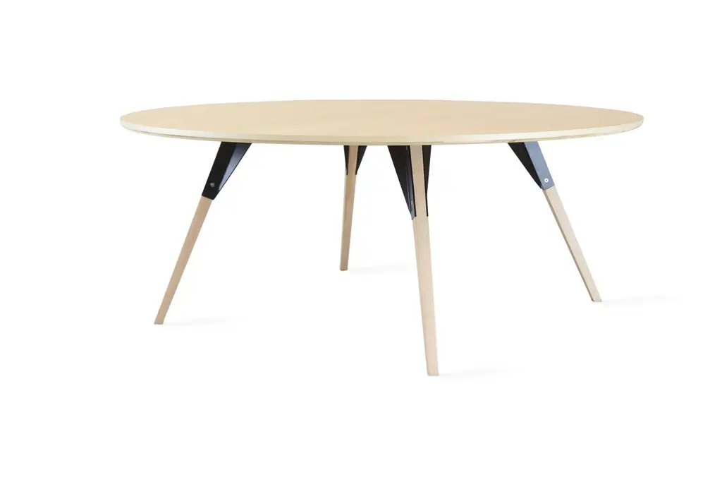 The Clarke Collection comes in ten different table top sizes, two wood species, and two metal finishes. The exposed stainless steel bolts blur the line between Scandinavian and Industrial styles.