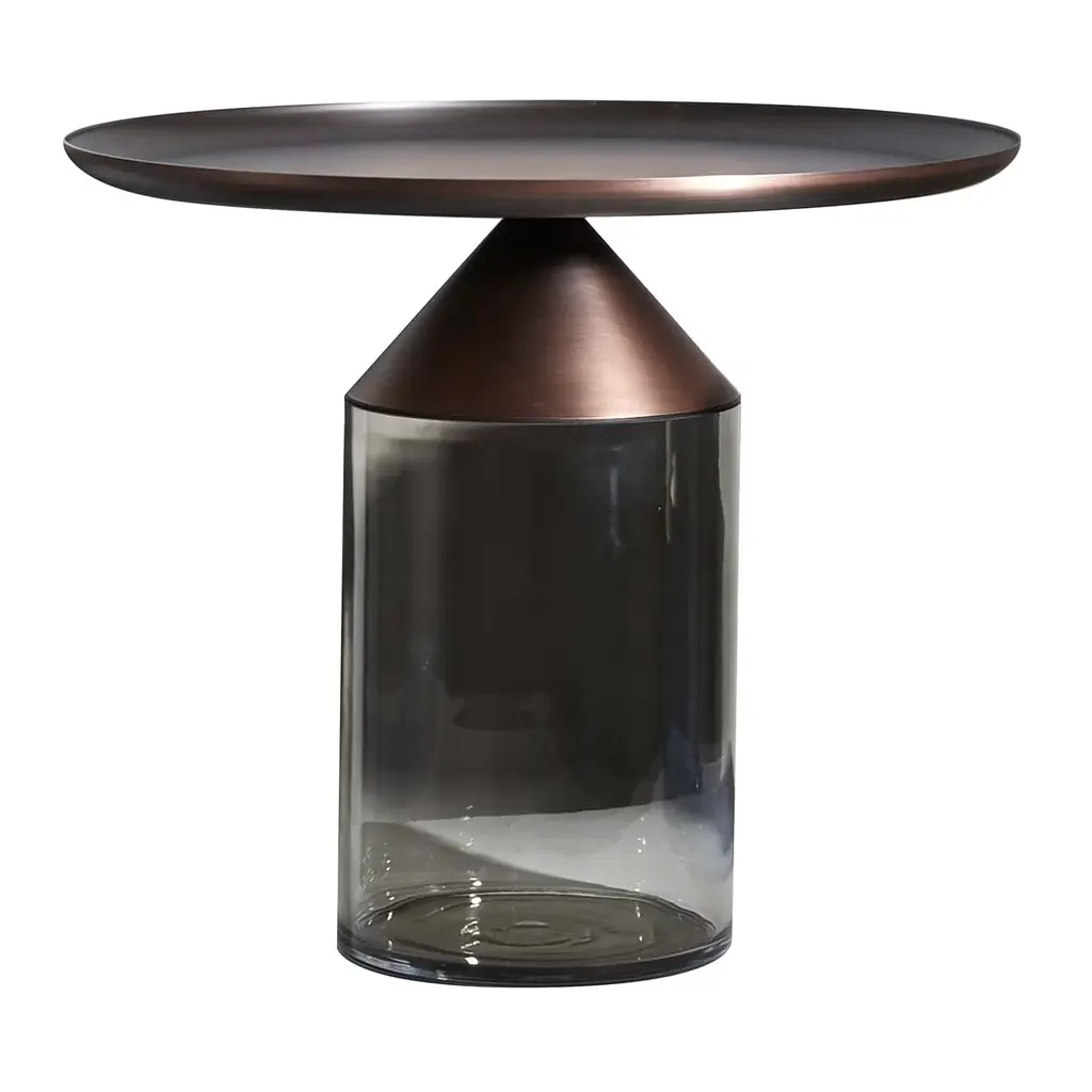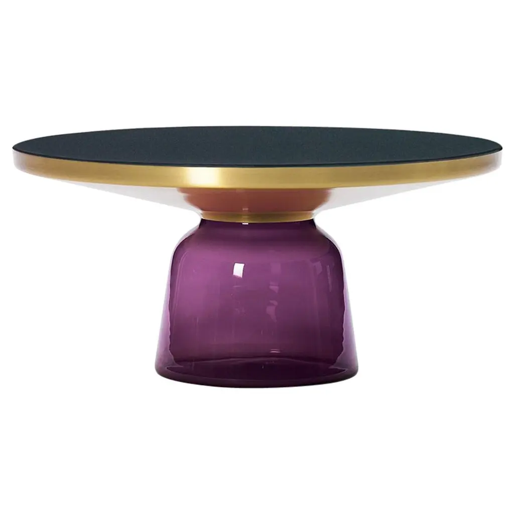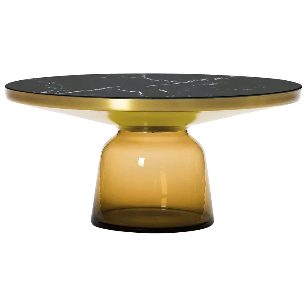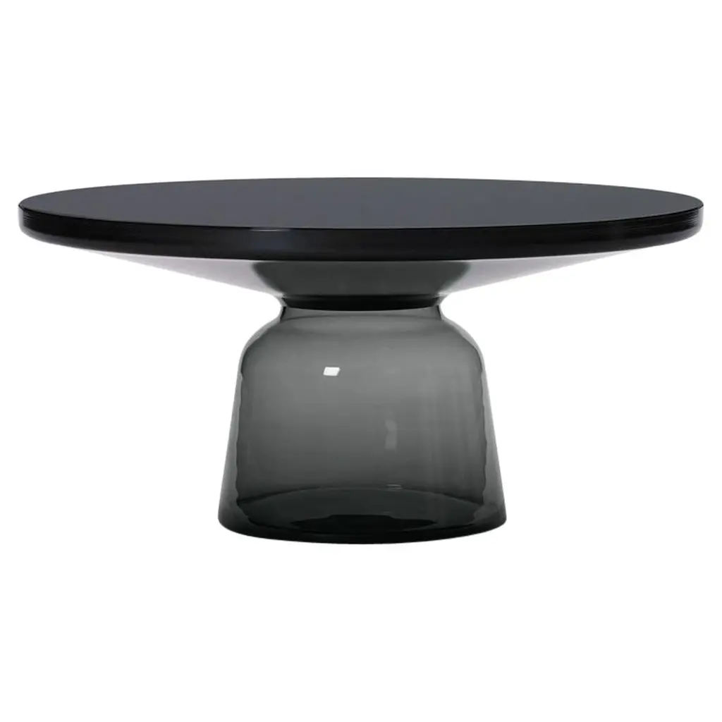 The “Bell Table” by Sebastian Herkner turns our perceptual habits on their head, using the lightweight, fragile material of glass as base for a metal top that seems to float above it. Hand blown in the traditional manner using a wooden mold, the transparent tinted glass base asserts a sculptural presence in space, contrasting intriguingly with the solid brass frame on top while also forming with it a harmonious unit recalling the elegant curving Silhouette of a bell. With its appealing reflective surfaces and contrasting materials, the side table adds a distinctive touch to domestic interiors. It celebrates the beauty of the materials with their colors and surfaces, along with the virtues of hand-craftsmanship. The bell table by Sebastian Herkner is a masterwork of traditional hand craftsmanship. Each table is handmade, meaning that small bubbles or bumps in the glass are a characteristic feature.Coffee table. Hand blown glass base in quartz grey. Metal Top frame of solid copper, unlacquered, with round tabletop of crystal glass, black lacquered. Handcrafted. Dimensions: Ø 75 cm, H 36 cm.Special edition copper tables are numbered.