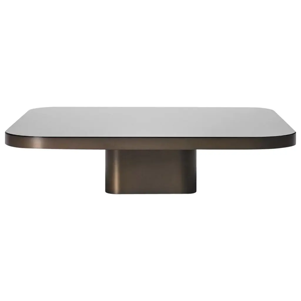 Inspired by 1970s lines and designs, Brazilian Guilherme Torres presents a side table or coffee table of casual elegance. The metal-covered surface of the body also quotes futuristic designs of the era, but it is a clearly contemporary design. The glass or marble covered tabletop floats above a base with rounded edges. The three sizes are coordinated in a way that allows the tables to be arranged individually or as a group and with overlapping tabletops, like a dynamic sculpture, resulting in a generous and multi-level storage surface.Coffee table made of burnished solid brass sheet, with clear varnish. Tabletop crystal glass, black lacquered. Height-adjustable felt gliders. Dimensions: W 70 cm, H 31 cm.