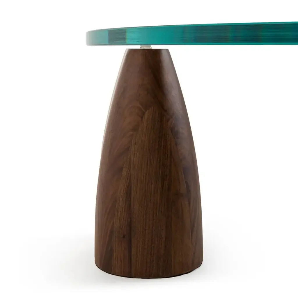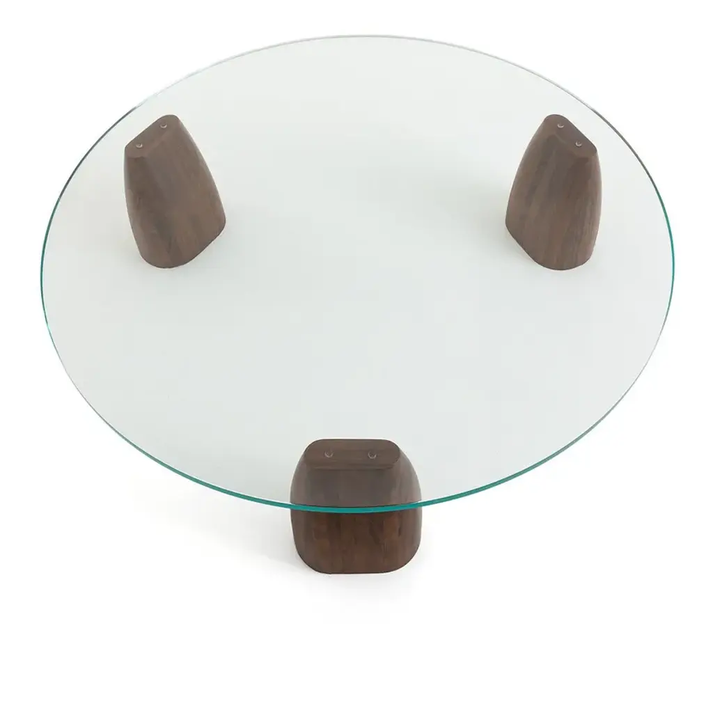 Thick transparent glass top, pebble-shaped legs, the Clay low table combines organic shapes and sculptural design. A mineral appearance reinforced by the tempered glass top that reveals three monolithic legs in solid FSC® walnut. Contemporary design and generous dimensions, a low table by AMPM.Thick round top in extra-clear tempered glass, 1.9 cm thick3 solid walnut FSC® legs with polyurethane finish