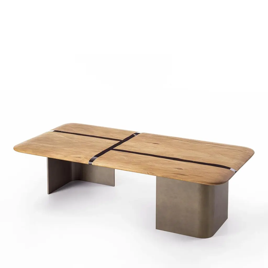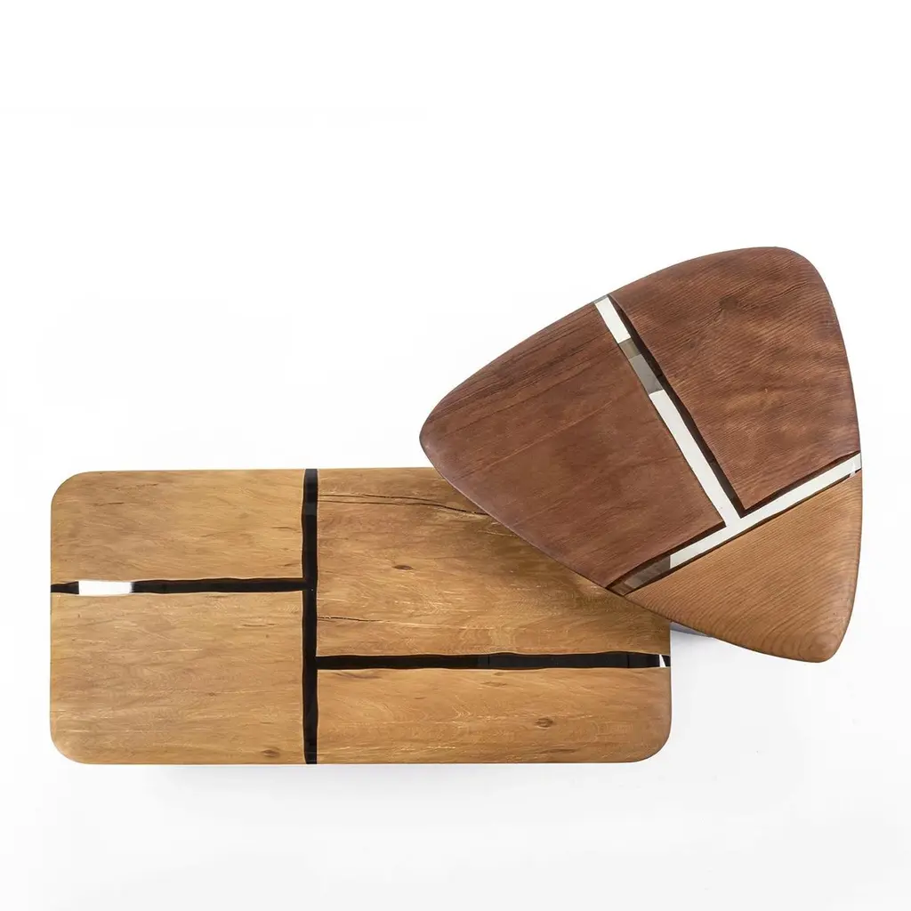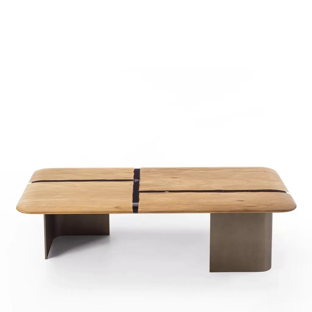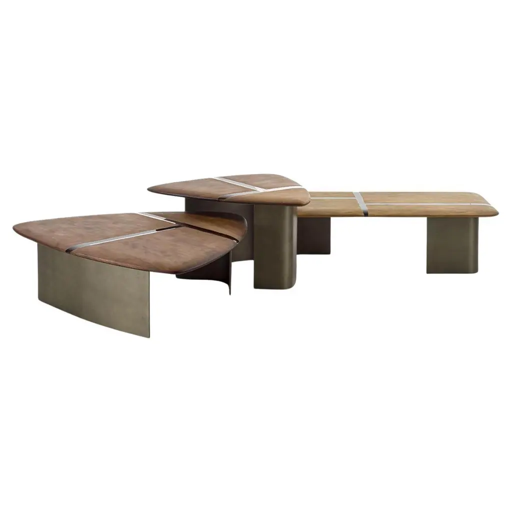 Coffee Table Clevered Kauri Wood Set of 3 with solid Kauri wood parts and resin. With lacquered steel base in bronze finish. Table A/ L81xD87xH46cm.Table B/ L112xD118xH33cm.Table C L120xD60xH33cm.Each table also available in height 33cm, or 46cm, on request.