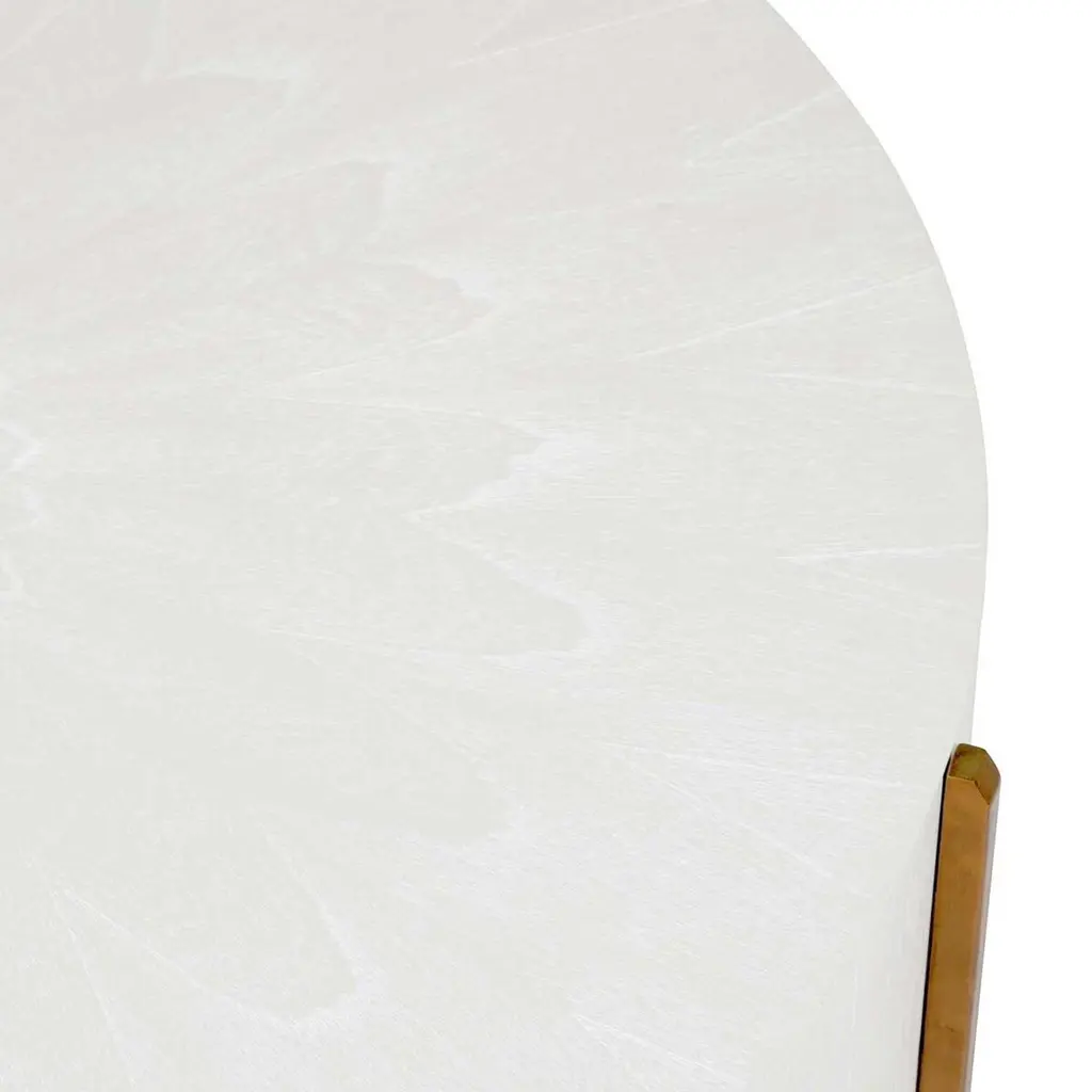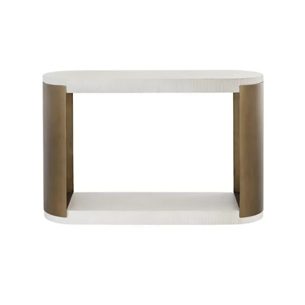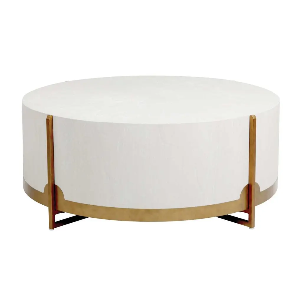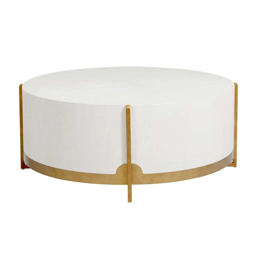A stylish drum shaped cocktail table in white and gold, the Clifton Coffee Table creates a floating illusion as a white cerused oak drum is supported by a brass tone metal base. A trim of brass along the bottom is accented by half moon detailing for a finishing touch.