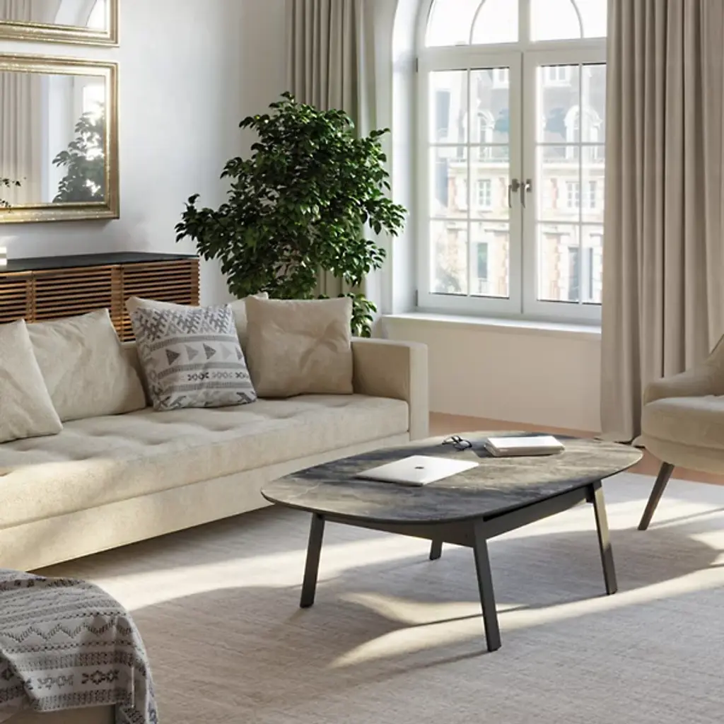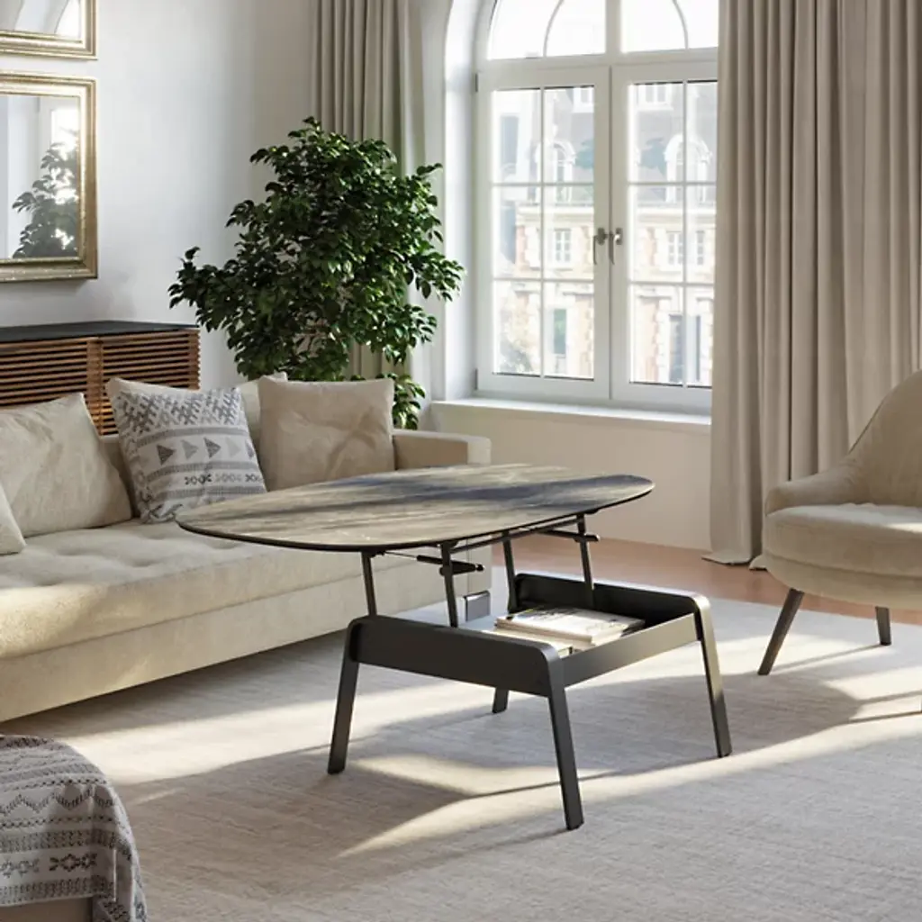 Round out the look of furniture arrangement with the BDI Cloud 9 Lift Coffee Table. This indoor hydraulic coffee table takes the concept of traditional furniture and spins it on its head. Built with a durable porcelain top and convenient lowered lined storage compartment, you'll never lose track of your entertainment essentials. The hydraulic supports allow for an effortless up and down movement, perfect for maximizing your productivity and entertainment time. Use this modern, ultra-versatile indoor coffee table to tie together the look of your living room or finished basement space.