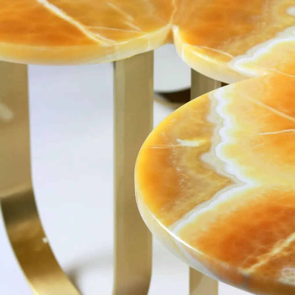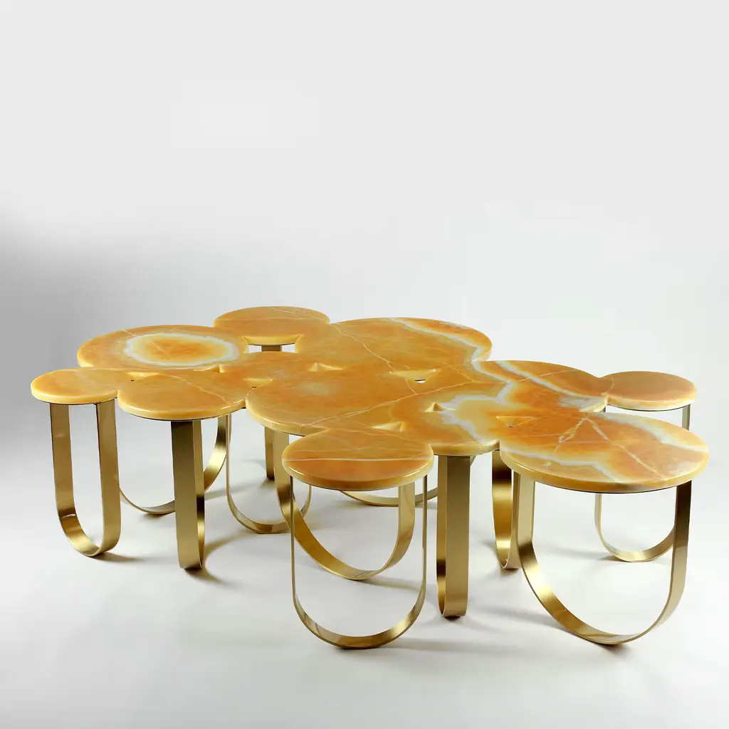 Cloud is a spectacular coffee table with a structure in brushed brass and top in rare orange onyx. The brushed finish of the brass creates interesting reflections of light. "We wanted to kidnap a cloud, slice it into thin sheets like it's done with blocks of marble". Each table is hand-signed, numbered by the artists (engraved) and 100% handmade in Italy. Limited Edition of 25. The artworks by Barberini & Gunnell are regularly shown at international art fairs.