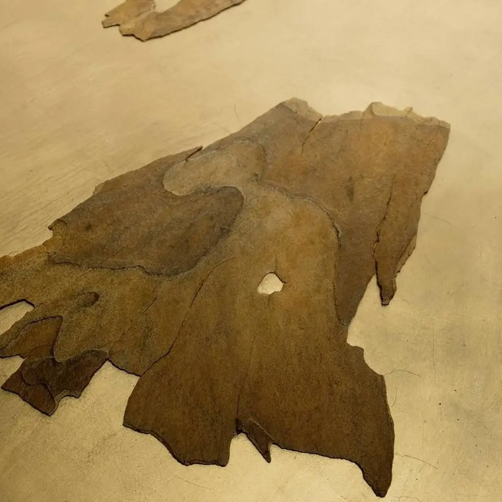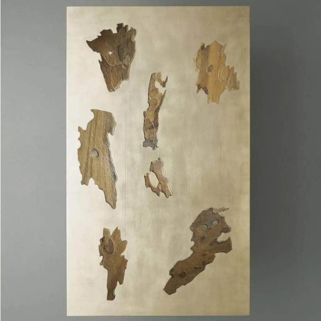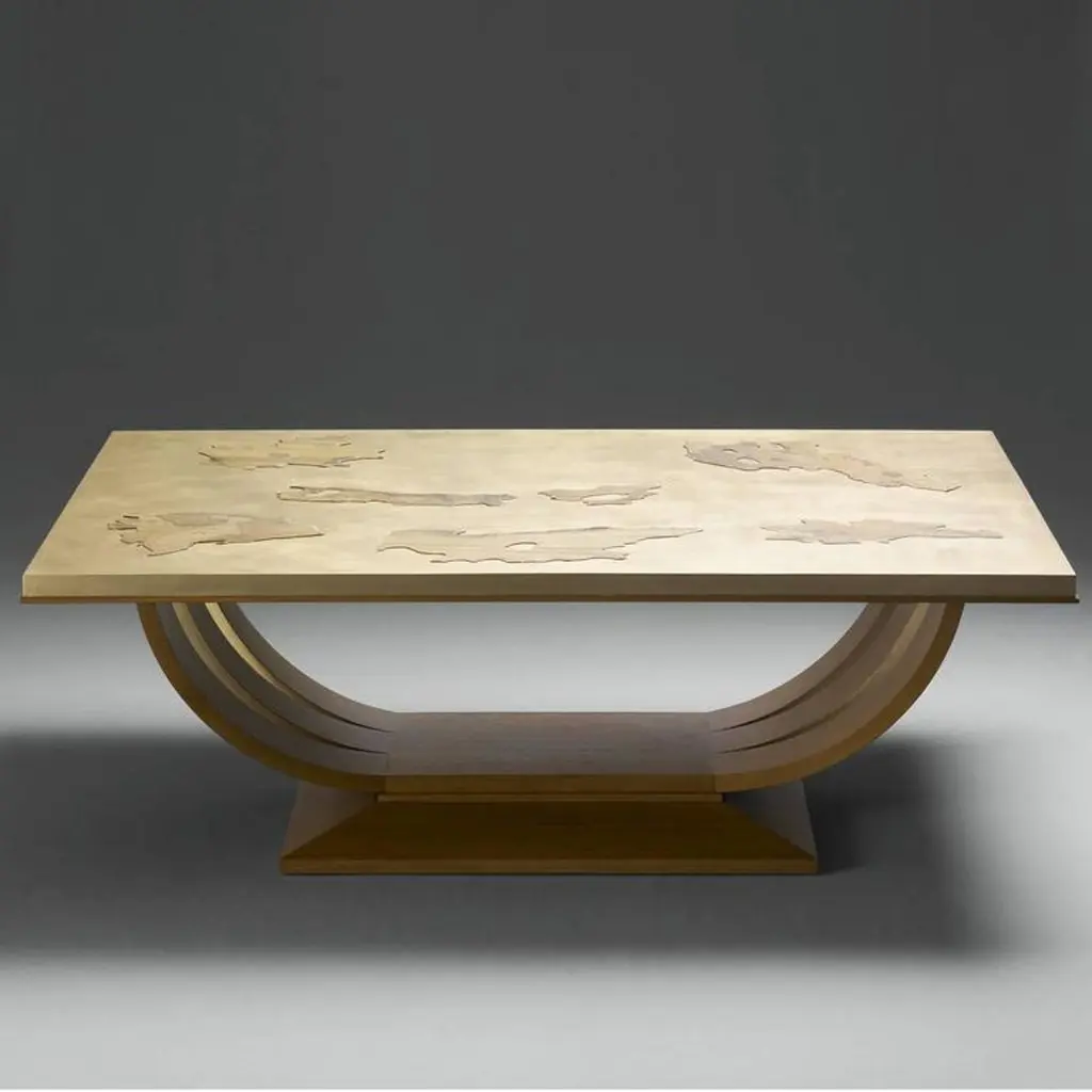 The top of this striking living room table has an opaque gold leaf finish and plane tree wood inserts in bas-relief. The base is a semicircle made of three crossing bands of oak wood resting on a rectangular base. Design by Teresa Luni.