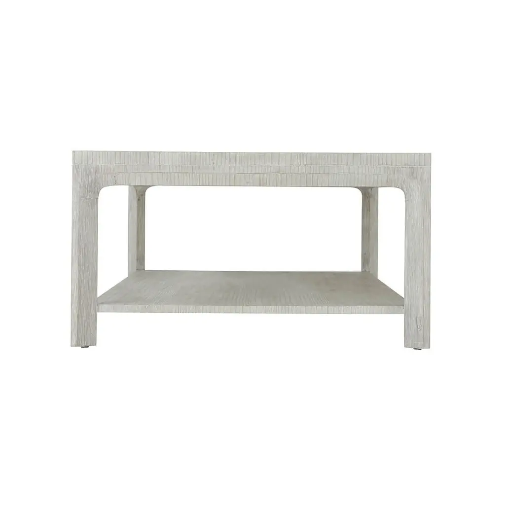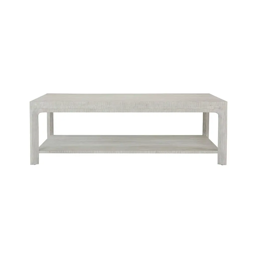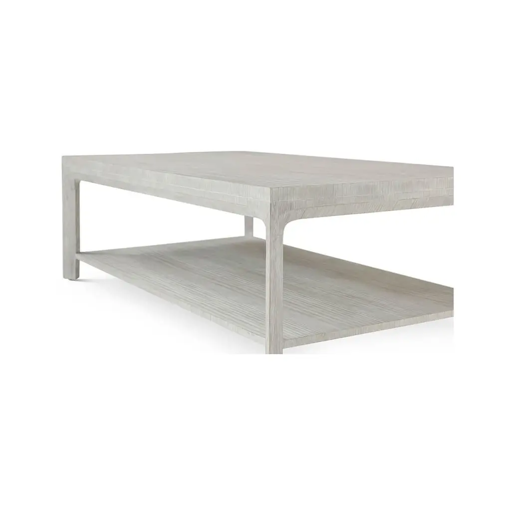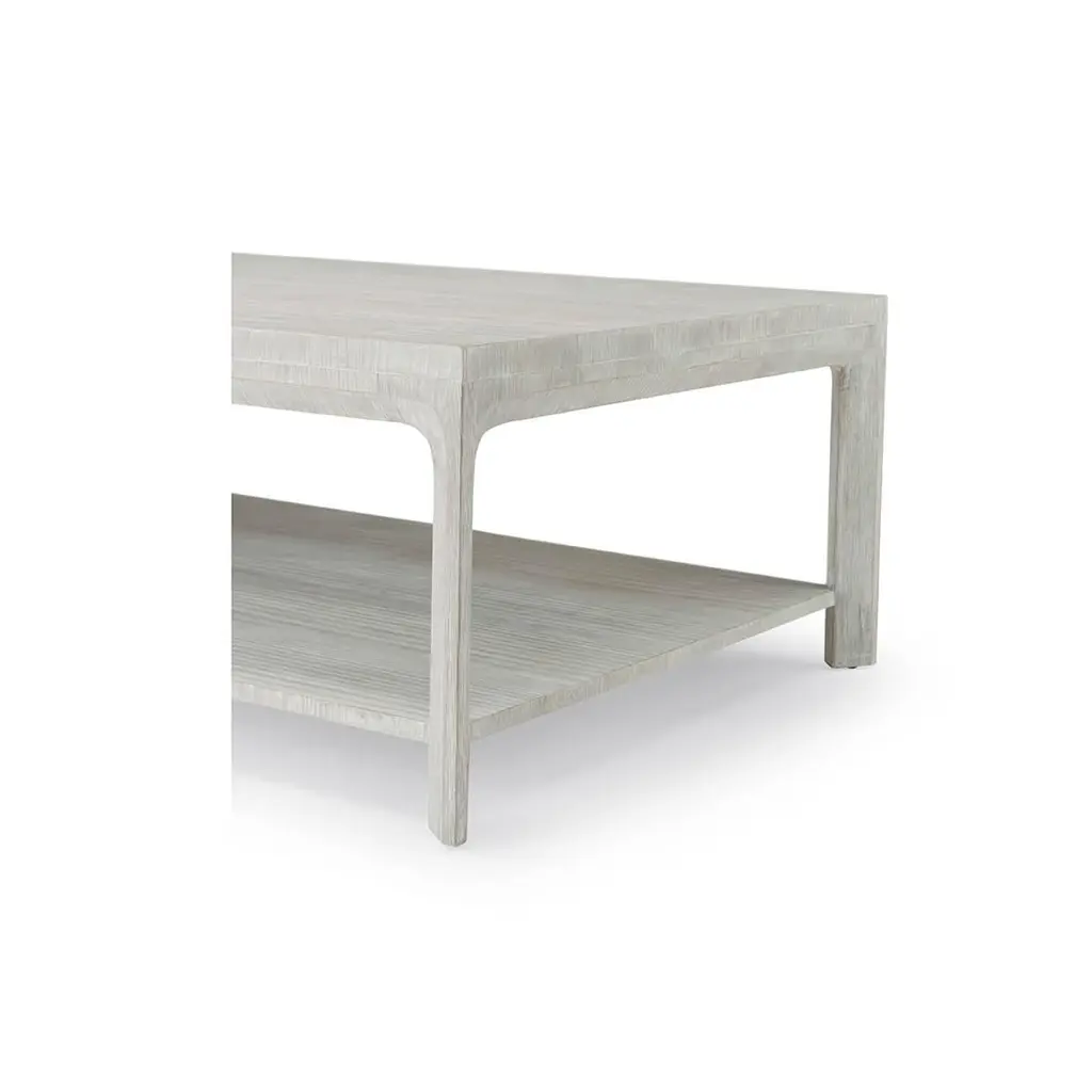 Expertly handcrafted from wire-brushed cerused pine with a beveled shaped cross section, this cocktail table is the perfect accent piece for your living room. It also includes a decorative lower shelf for extra storage and display.Dimensions: 54" W x 32" D x 17.5" H