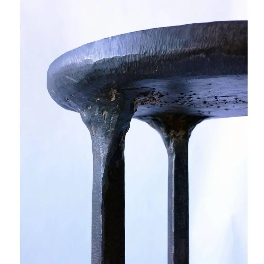 TABLE NO. 3 - Nesting PairJ.M. Szymanskid. 2017These handcrafted side tables were designed to interact and live with one another. They can nest within each other or live separately. Each table is hand carved form blackened steel. Custom sizes available. Made in the Bronx, New York, USA.Our products are fabricated and finished by hand, so variations in size, shape, and patina color are a natural result of this process. Tooling marks and surface scratches are part of the character of many finished pieces. All products are sealed with oil and wax, which, over time, are not impervious to moisture. Our blackened steel pieces installed outside or in areas exposed to moisture indoors, especially in marine environments, will rust. Condensation from hot and cold drinks will leave rings on blackened steel table tops. Coasters or placemats can protect the finish. Periodic maintenance of blackened steel items may be required.