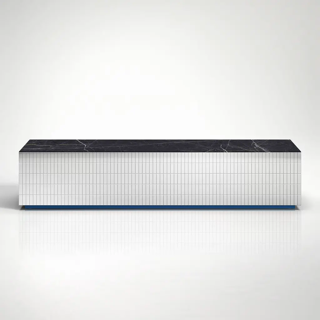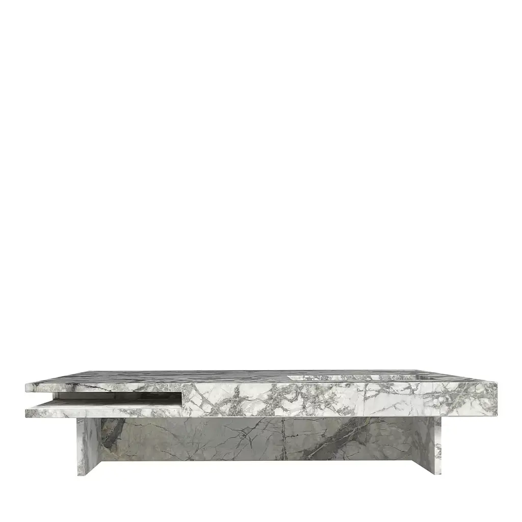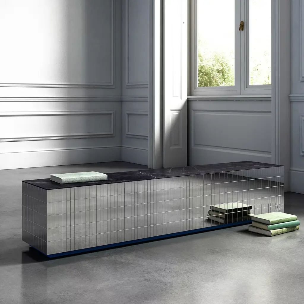 Coffee table with chrome steel sides and New Saint Laurent marble top. The fragmented mirror-like surfaces create an illusive effect, letting the piece being perceived mostly through the environment it reflects. The base element is lacquered in a light cobalt blue tone.
